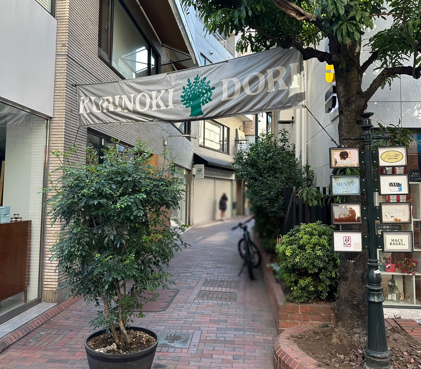 自由が丘駅南口から徒歩1分、細い小道「KURINOKI DORI」があります。たくさんの飲食店やアパレルショップが並ぶ、賑やかな石畳の「マリクレール通り」から、九品仏川緑道へ向かう道です。