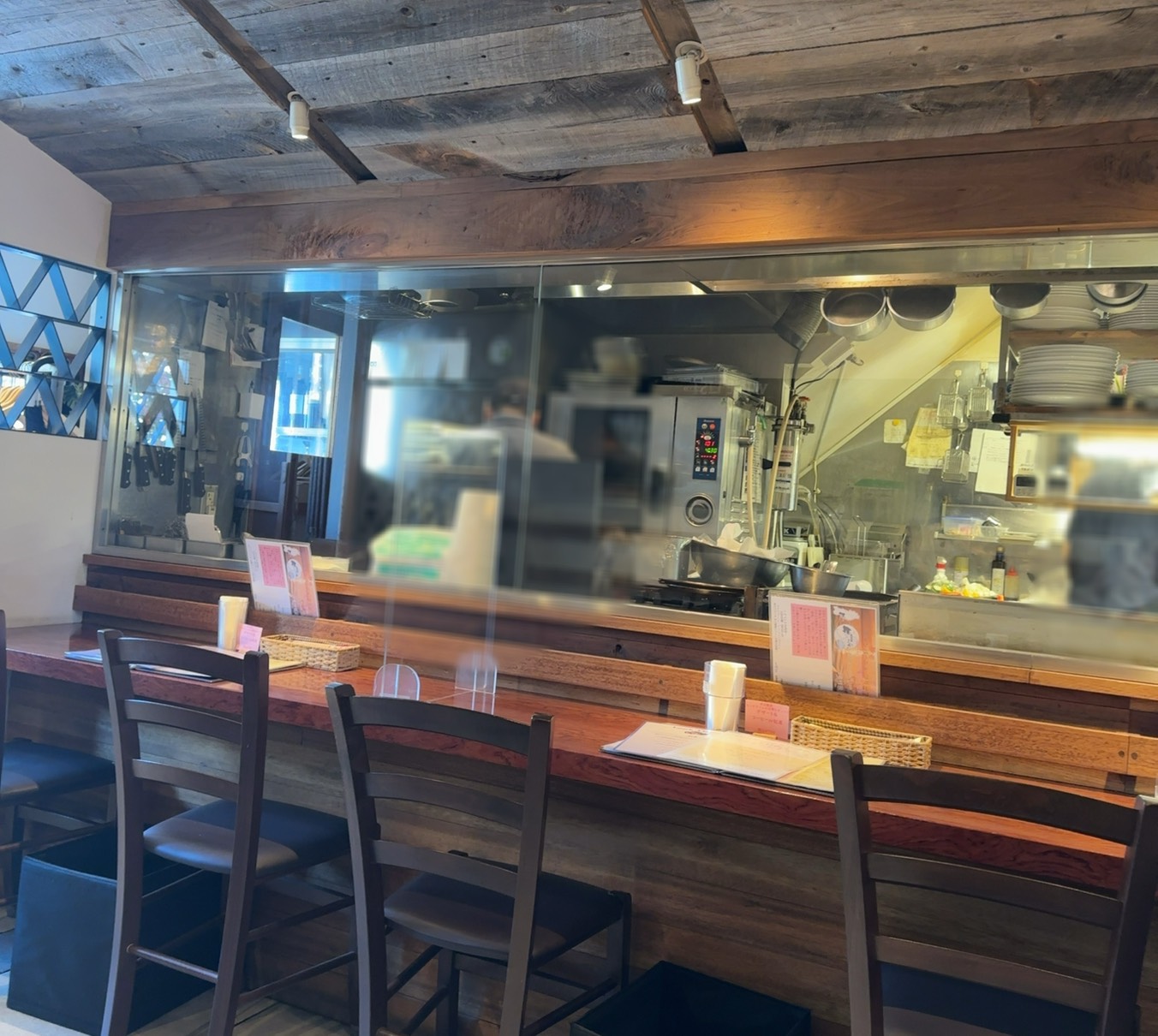 自由が丘駅南口から徒歩約5分のところにある「自由が丘マリスコス」。創業30年以上の老舗ビストロです。 おしゃれでかわいいこじんまりとした入口ですが、店内は奥行きがあり、ガラス張りのオープンキッチンで、広々としています。テーブル席だけで