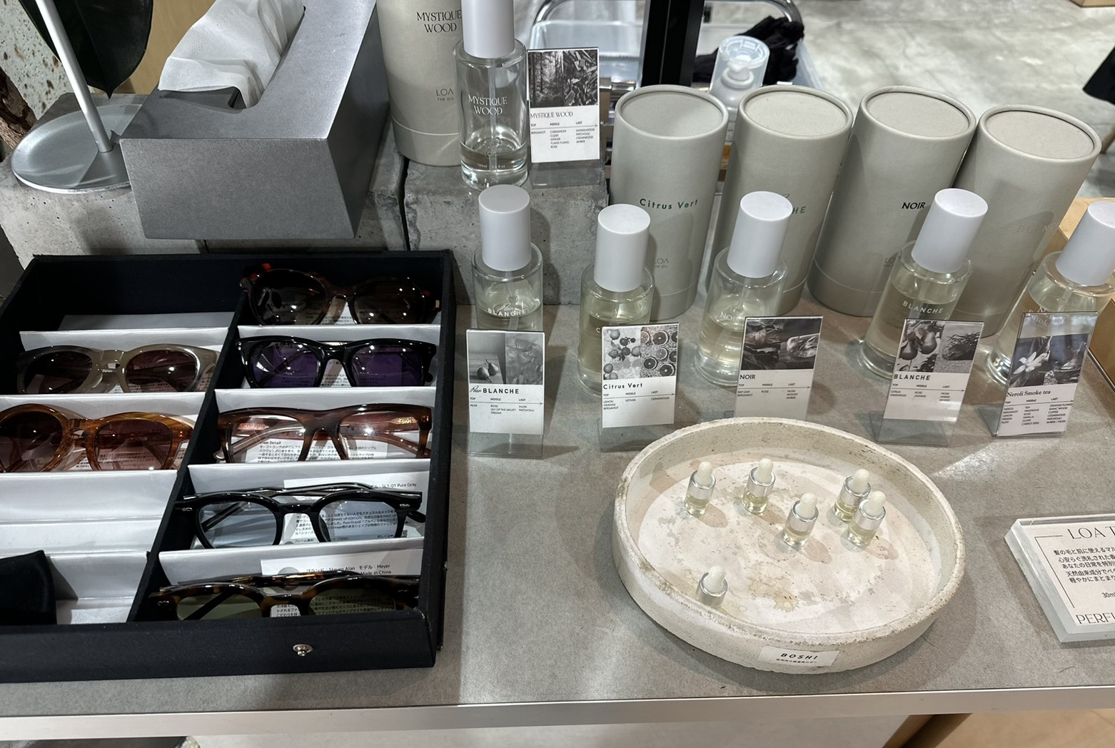 店内奥が美容室、窓側がカフェとなっており、その間のスペースには厳選されたスタイリッシュでおしゃれなアクセサリー、スキンケア用品などの商品が置いてあります。