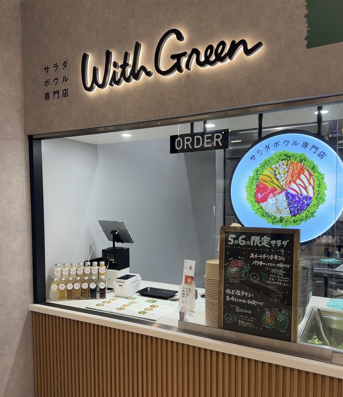 「WithGreen(ウィズグリーン)」は、国産野菜を使用し、日本の四季折々の旬の野菜にこだわり、トッピングの肉や玄米にも厳選を重ね、12種類のドレッシングを提供しています。