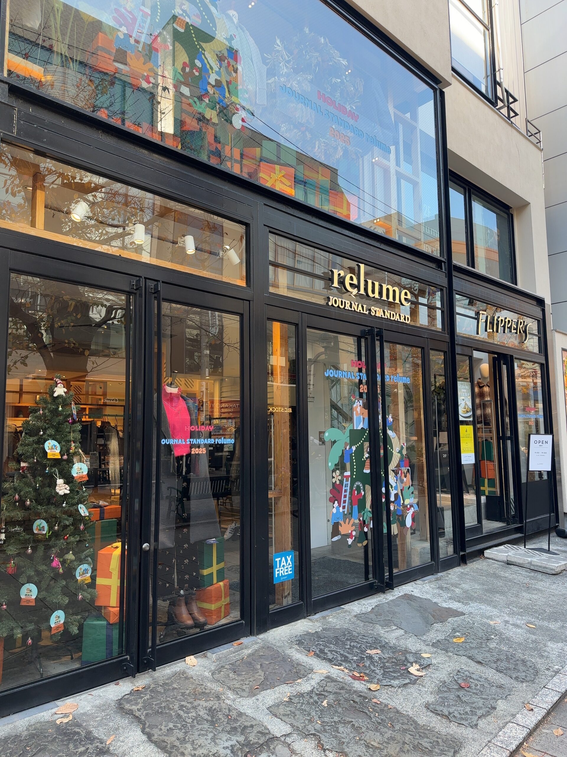 「JOURNAL STANDARD relume自由が丘店」。自由が丘駅南口から徒歩2分の、九品仏川緑道沿いにあります。