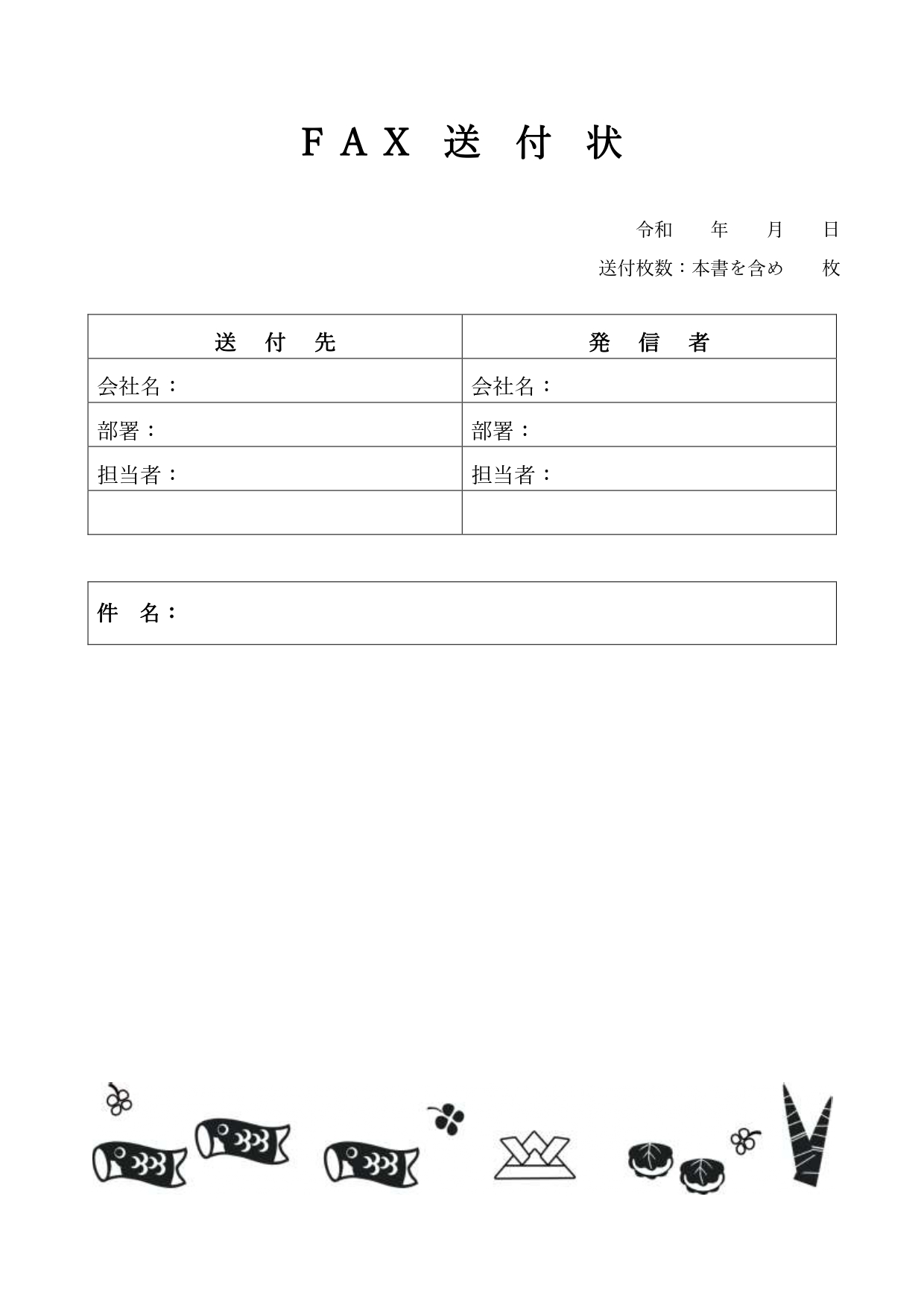 FAX送付状・5月・子供の日のかわいいイラスト!モノクロ(白黒)「Excel・Word・PDF」のテンプレートとなります。ダウンロードを頂く事で、5月の子供の日をイメージした鯉のぼりがイラストでデザインされたFAX送付状となります。5月に出す送付状や添え状など編集後に利用出来る鯉のぼりのイラストデザインです。