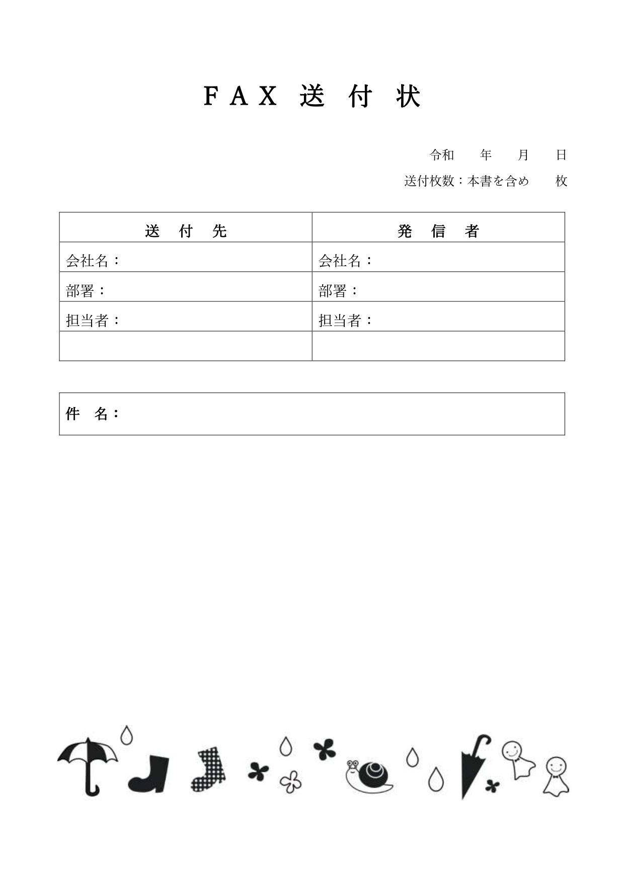 FAX送付状・6月・梅雨のかわいいイラスト!モノクロ(白黒)「Excel・Word・PDF」のテンプレートとなります。ダウンロードを頂く事で、雨傘や長靴、蝸牛・てるてる坊主と雨具のイラストが下部に描かれている6月をイメージしたデザインです。梅雨の時期に出す送付状や添え状となり、会社内や取引先など様々な用途え利用可能です。