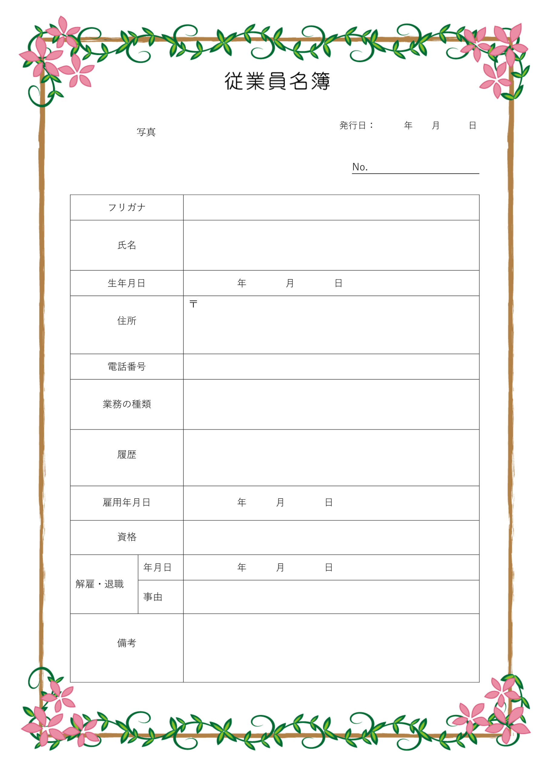 従業員個々の名簿として温かみのあるものをと木のフレームにピンクのツル草を絡ませたデザインにしました。1枚のフォーマットで個人の情報をしっかりと把握することができる、おしゃれな従業員の個人名簿のテンプレートです。