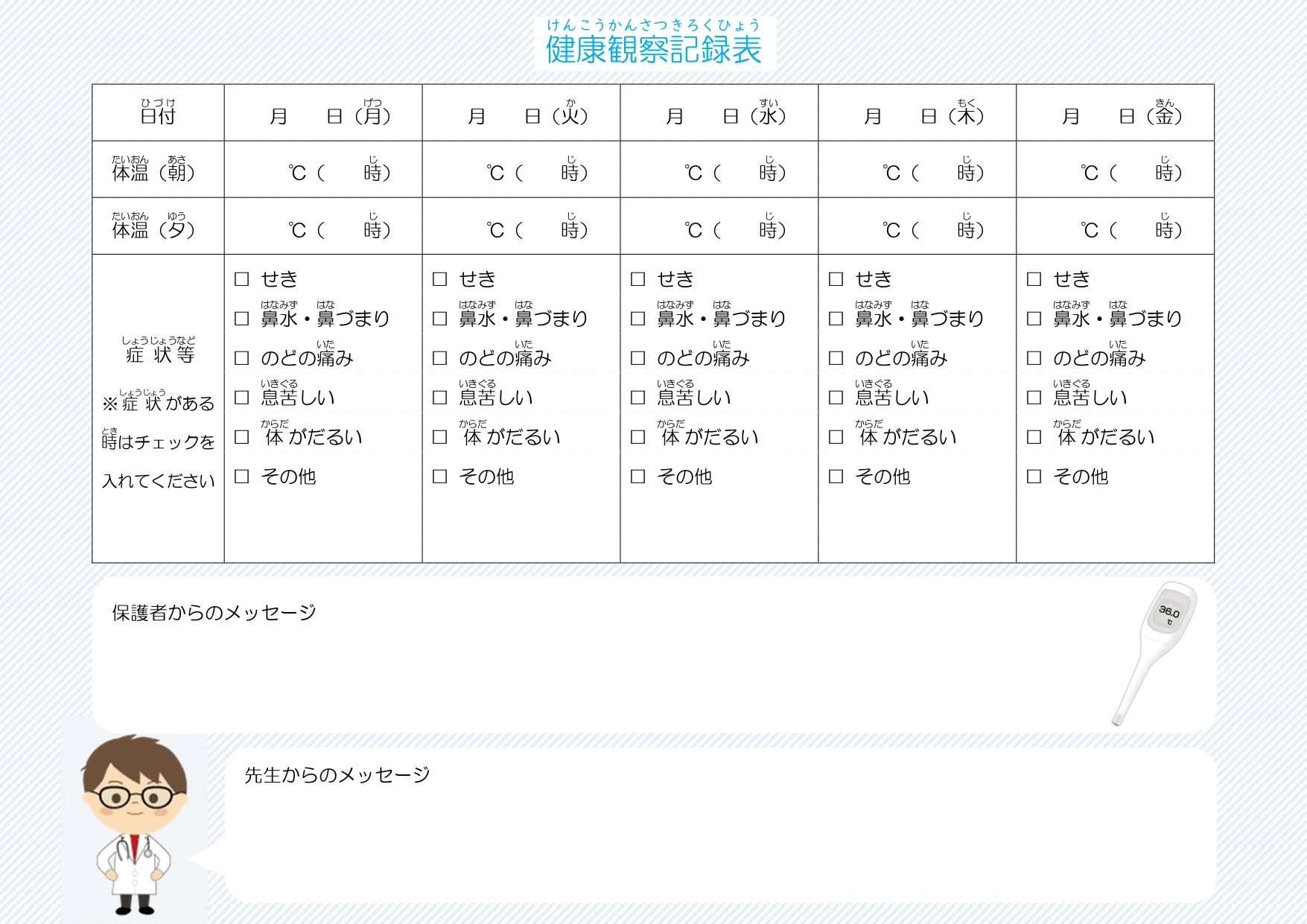 職場や学校などの集団感染予防にオススメ☆ 新型コロナウイルスでの毎日の健康観察として、また学校の水泳授業時の健康記録にも使える!健康観察記録票のテンプレートです。このテンプレートは、体温の記録はモチロン、体調不良のチェック項目もあります。お子様自身でも記録しやすいように、漢字に読みがなも表示されています。