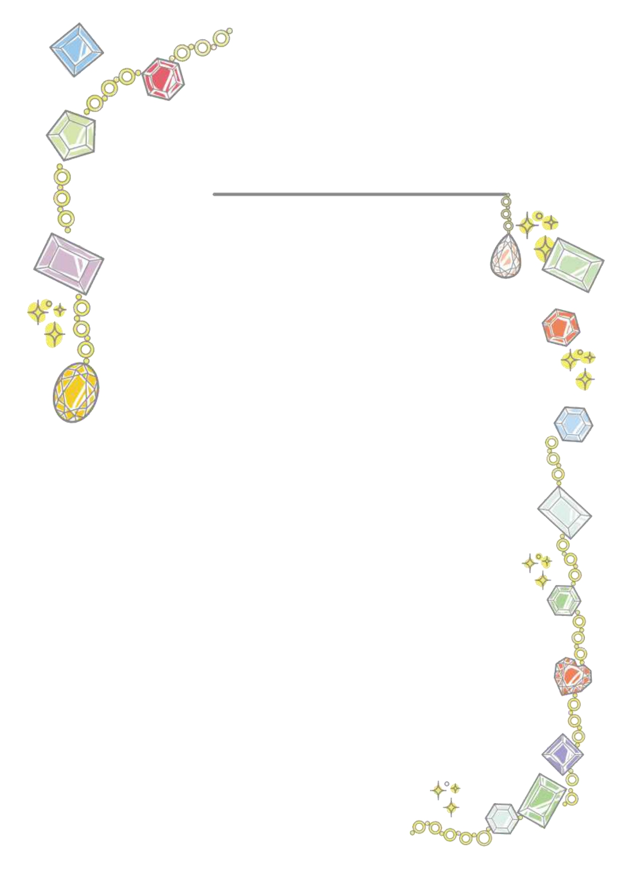 カラフルな宝石を飾ったチャームがイラストで描かれている、かわいいデザインとなります。お店の店内や店舗の張り紙以外にも職場の掲示物を作成する時のデコレーションや、メッセージカードのフレームとして利用、小学校の教室での張り紙など様々な用途で利用出来る宝石とチャームのフリー素材です。