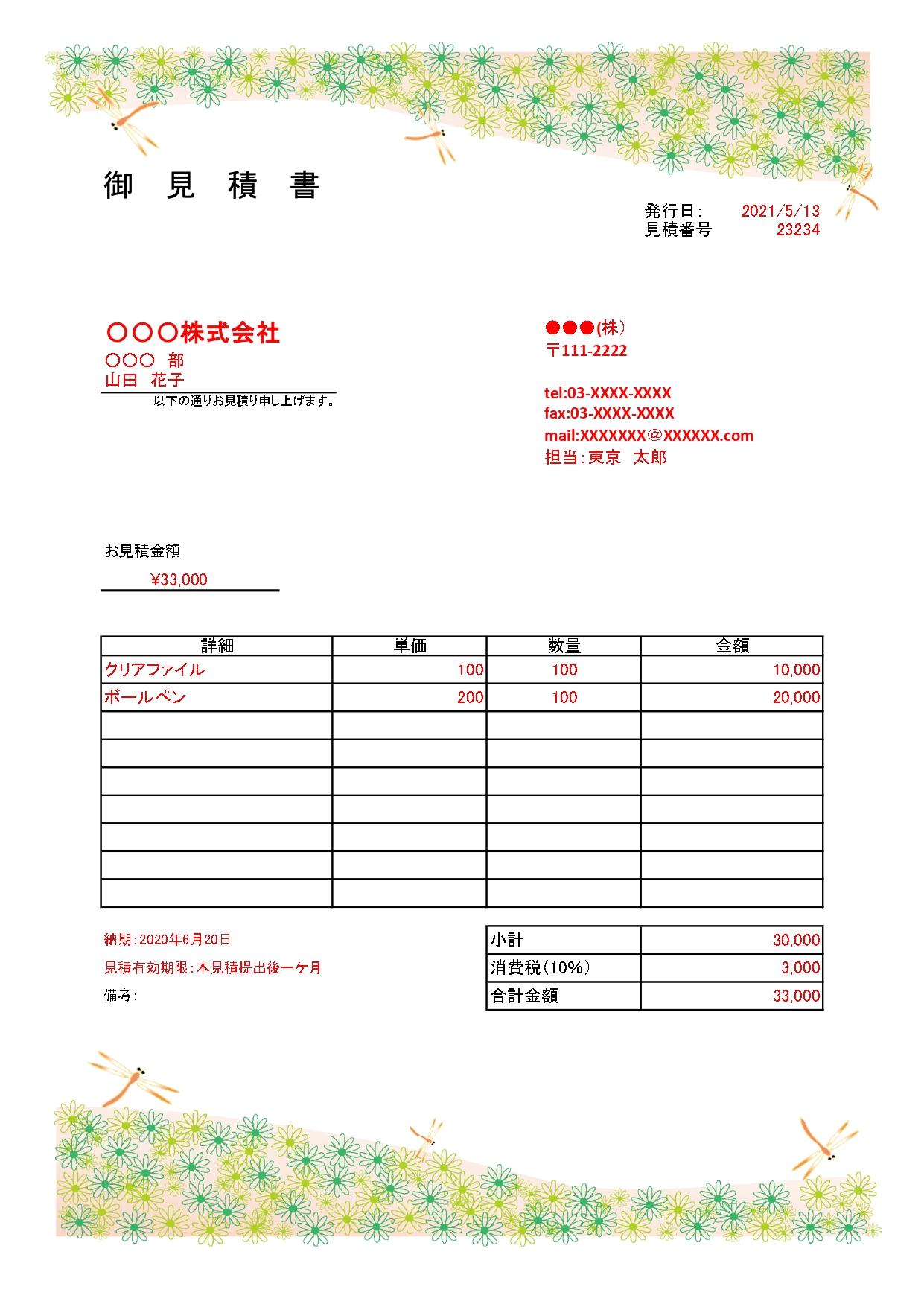 トンボ&ヒナギクがデザインされた見積書「おしゃれ・Excel・Word」のテンプレートとなり、上部と下部にトンボ&ヒナギクが可愛いらしい雰囲気で、イラストで描かれている見積書となります。お店や店舗、個人事業主やビジネスなど幅広く利用が可能なワンポイント入りの書式となります。