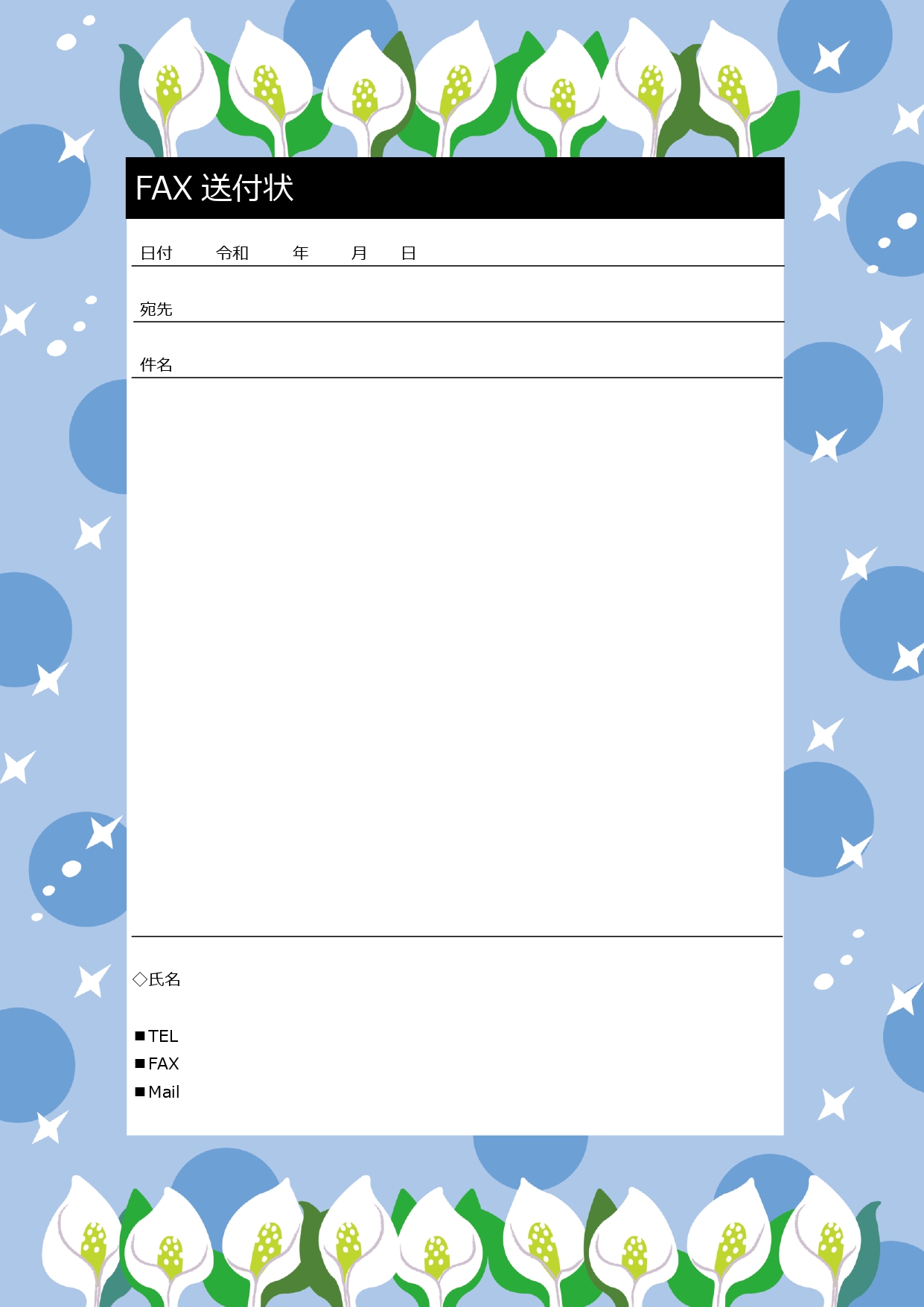 ありそうでなかった水芭蕉のイラストで描かれた、おしゃれなお花のフレーム付きFAX送付状です。清潔感があり、上品で目を引くデザインです。大切な取引先へ送信する際の送付状におすすめします。家庭用やビジネス用、様々な場面でご活用ください。Word・PDF対応の素材ですぐにご利用いただけます。書き方が簡単な雛形です。