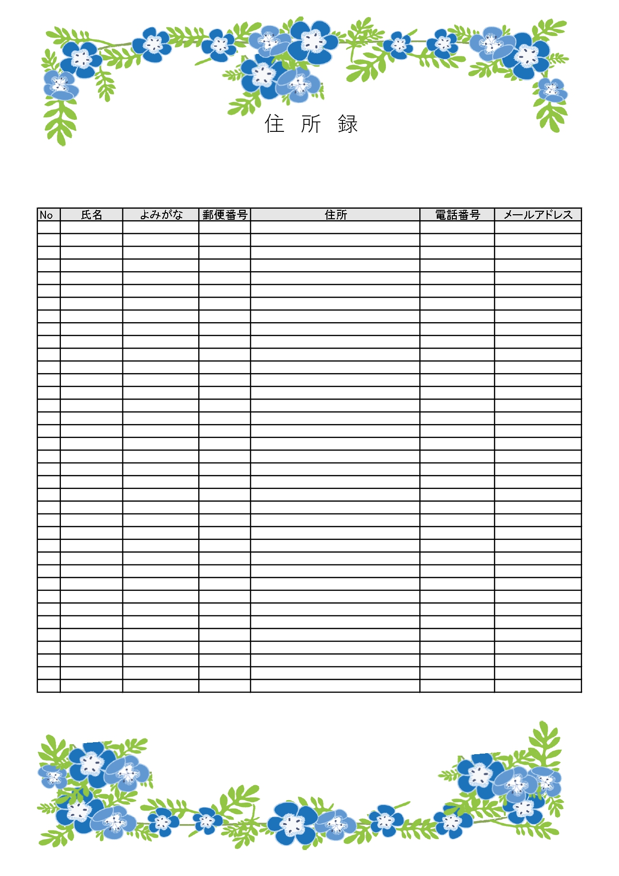 ブルーのネモフィラの花が華やかにデザインされた、上品な住所録のテンプレート!