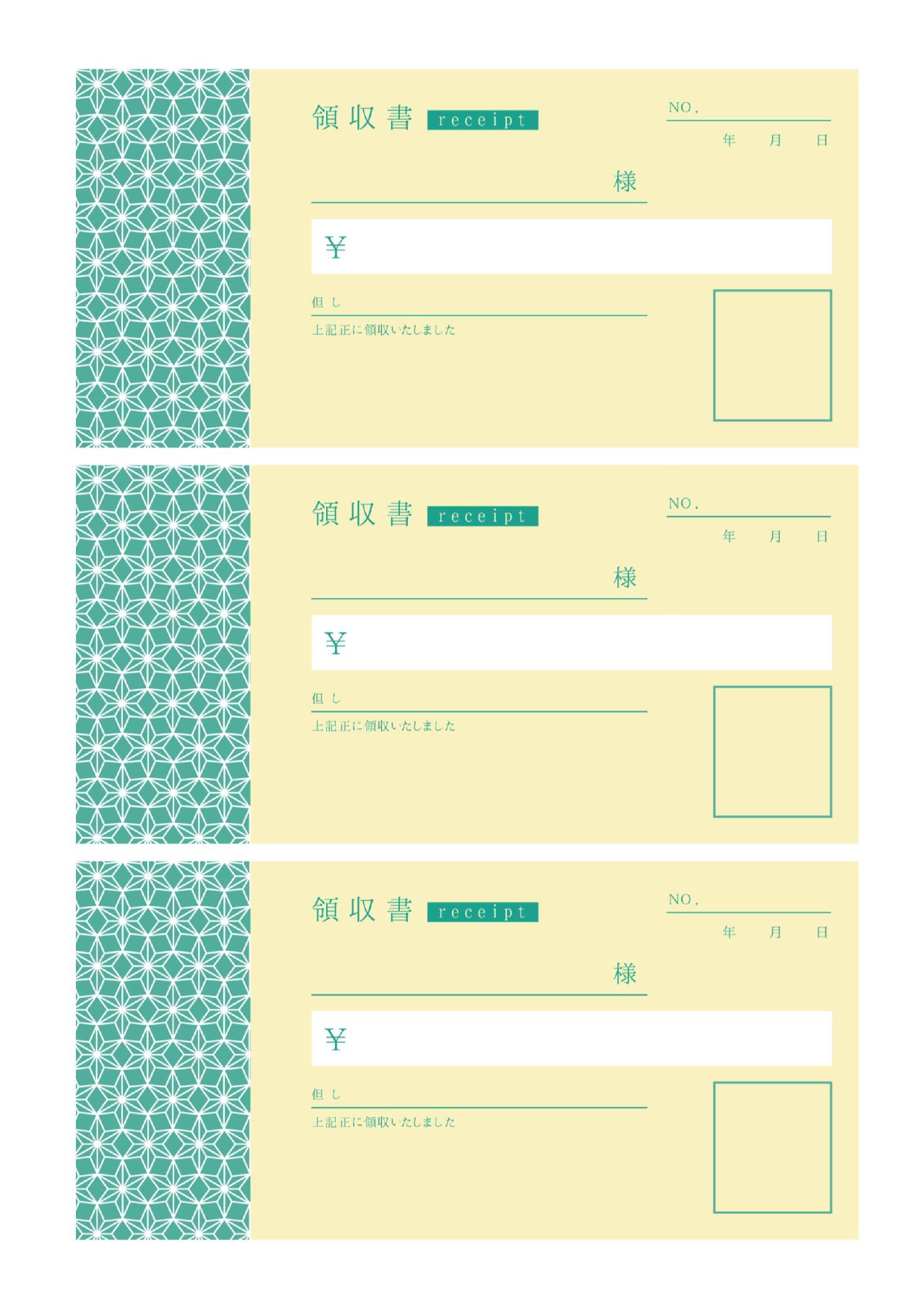 領収書として使える和風のおしゃれフォーマットです。A4の用紙に3枚分作成でき、プリントして切り取ってお使いいただくことができます。和柄をアクセントとして取り入れ、落ち着きがありながらも色味やデザイン性も兼ね備えた、若い方にも好んでお使いいただけるような和モダンテイストの領収書になっております。