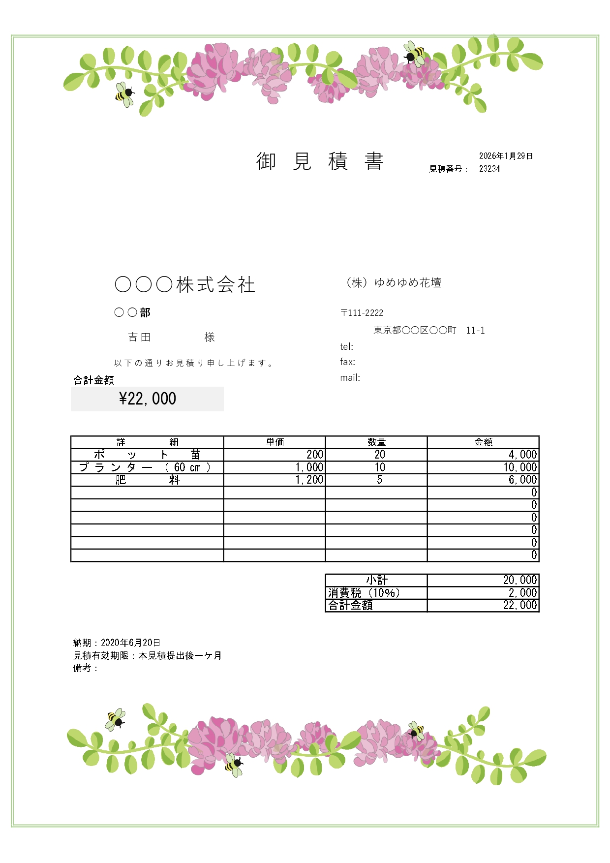 レンゲ草とミツバチのデザインが上下に描かれた見積書のおしゃれで使いやすいフォーマットとなります。無料でダウンロード後にご利用頂けます。全体を緑の二重線で囲われた、とてもデザイン性の高い、美しい見積書です。レンゲ草は桜の花が終わり暖かさが増してきた頃に咲く花ですので、4月に発行するお見積書に最適です。