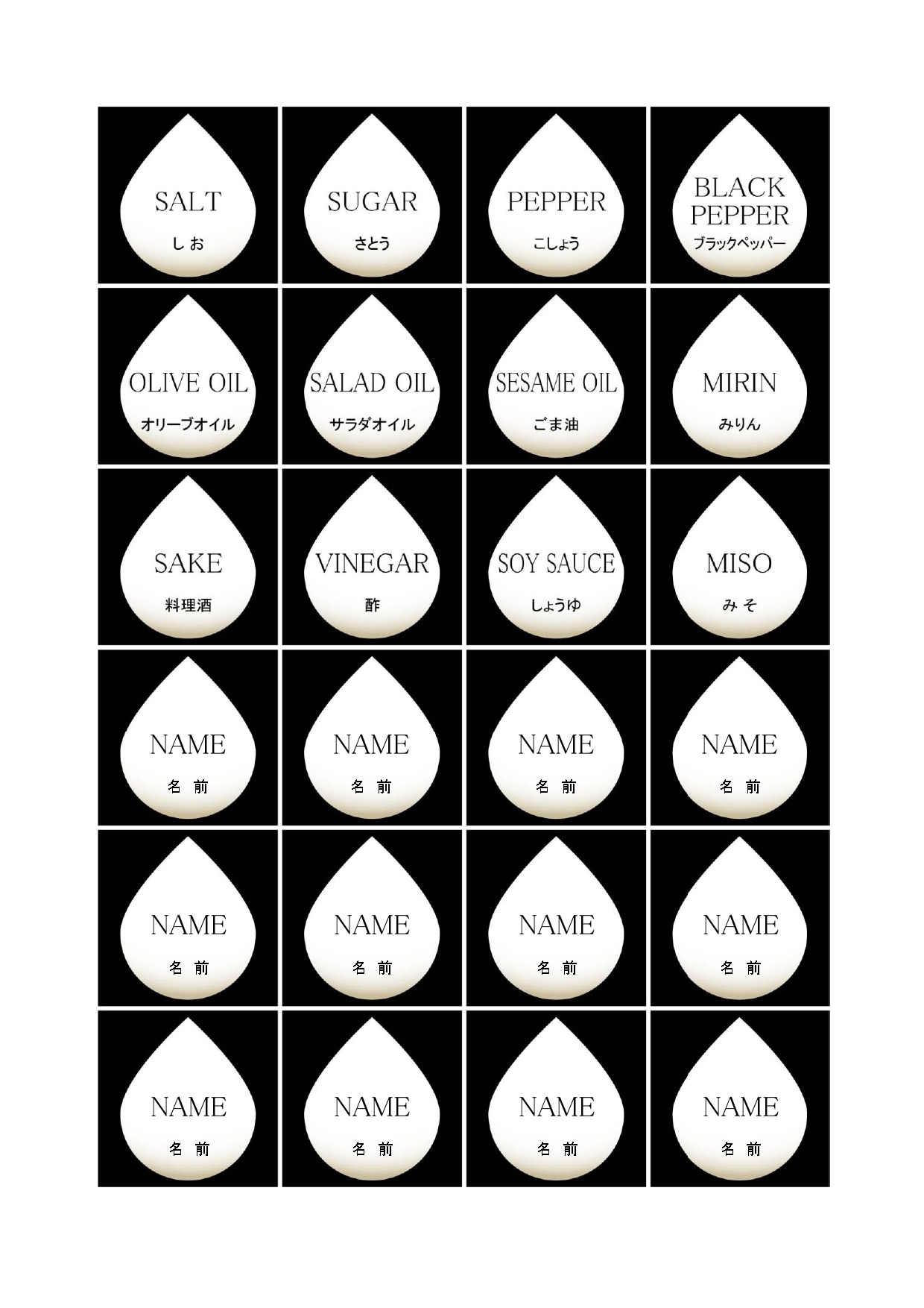 調味料名の部分は英語・日本語共にテキストボックスになっておりますので、WordやExcelで作りたいラベルを自由に入力して作成していただけます。プリントしてから手書きでお使いいただくこともできます。A4サイズのシール用紙にプリントし、それぞれ切り離してお使いください。
