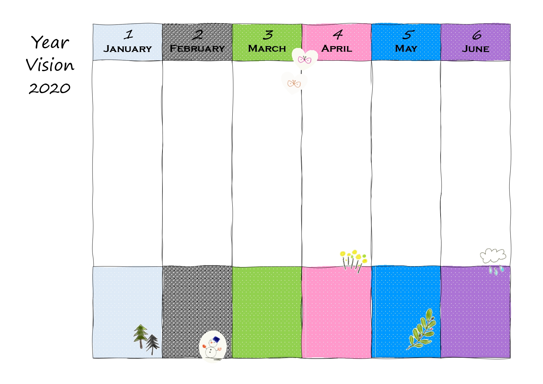 半年のスケジュールを書き込む事が出来るオシャレな雰囲気のテンプレートです。月間スケジュールも人気ですが、半年分のスケジュールを立てておくことも物事を効率的にこなしていくコツです。