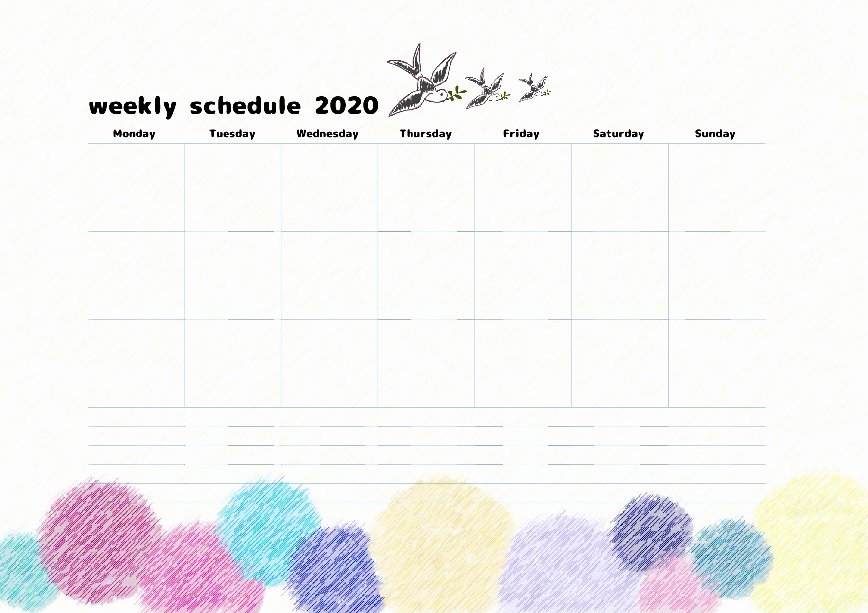 カラフルでかわいい丸いイラストの上に3羽の小鳥が楽しそうに飛んでいる、おしゃれな週間予定表!