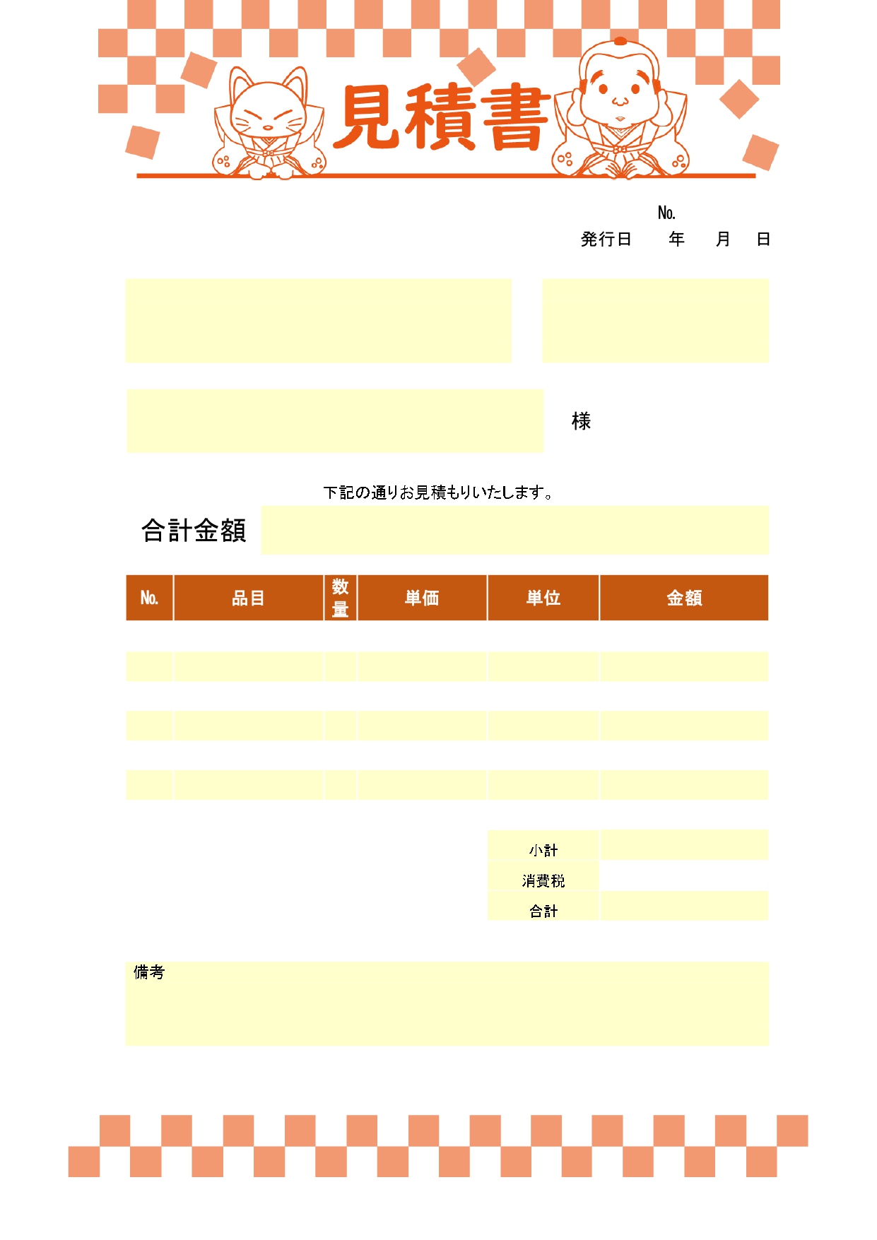 【商売繫盛】縁起の良い福助と招き猫のデザインが入った楽しい見積書のテンプレート! 縁起がいいと言われる、福助と招き猫のイラストが入ったお見積書のテンプレートです