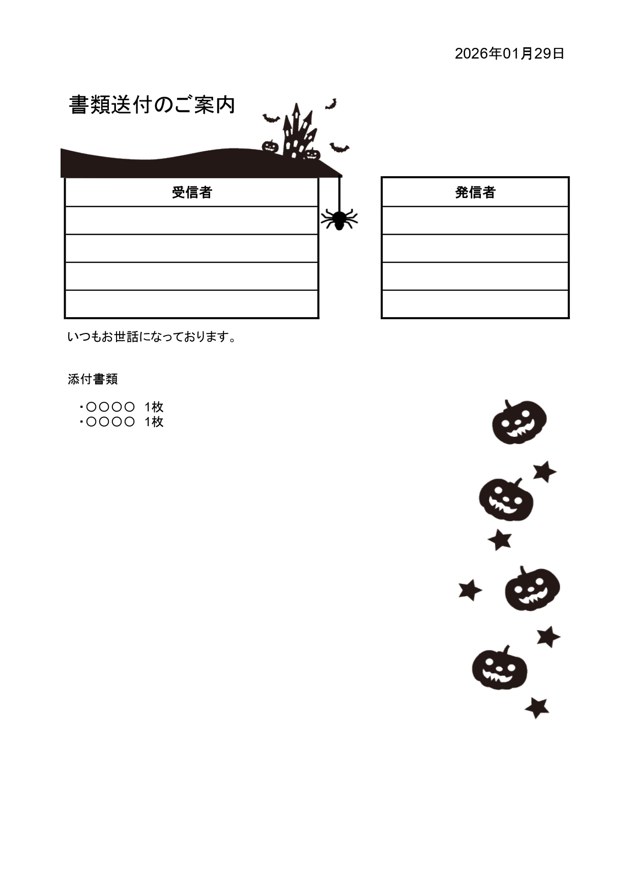 ハロウィンのデザインの送付状をお探しの場合は、ダウンロードを行う事で、エクセル・ワードが編集可能な状態で利用が可能です。ダウンロード後に送信者欄や送信先などの内容を記載しPDF化を行い印刷する事で、簡単に利用出来る10月のイラスト入りの送付状となります。