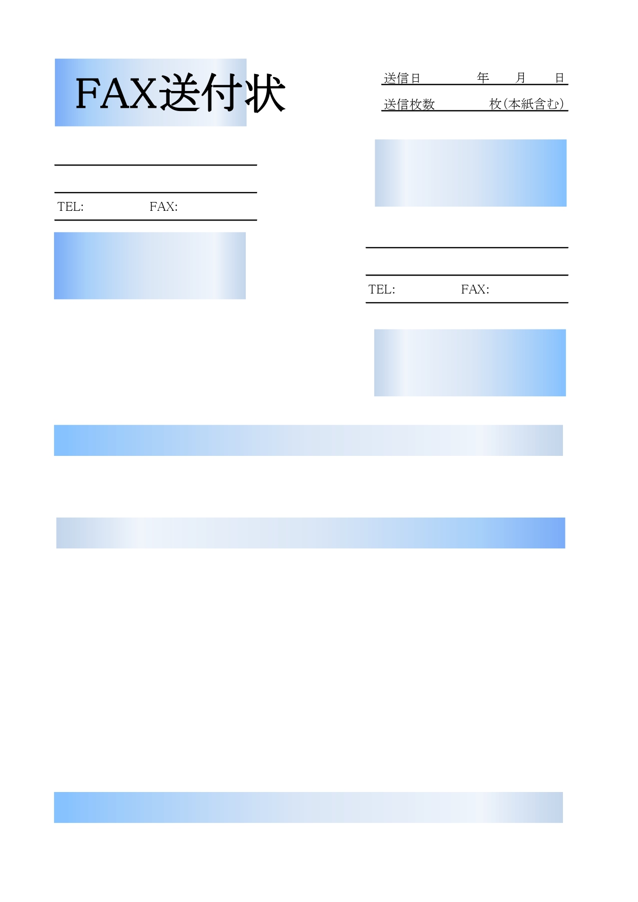 オシャレで見やすい!FAX送付状(青色)個人事業主・店舗・お店などにおすすめのテンプレートとなります。青色がメインで、デザインはシンプルですが、オシャレな雰囲気の送付状となります。