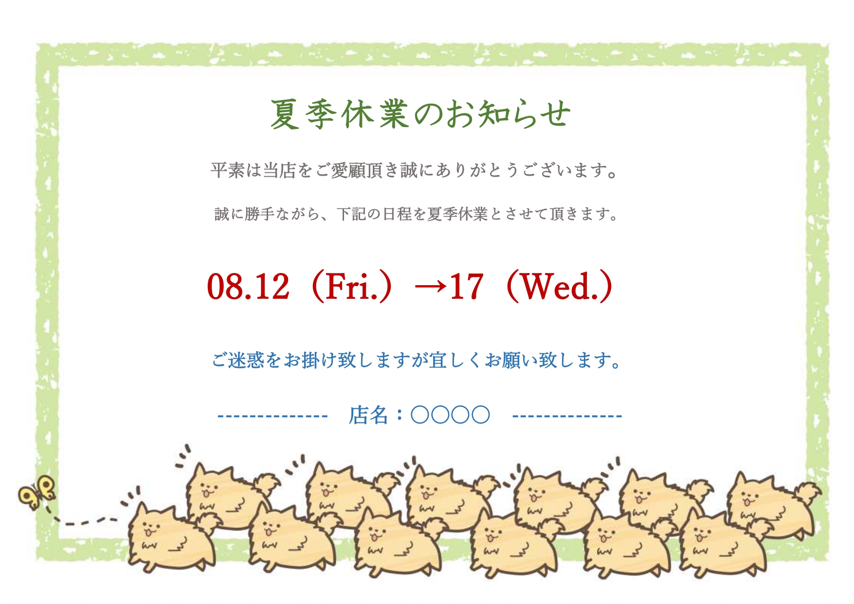 夏季休業の挨拶文&例文入りのお知らせ・張り紙を簡単に「Word」案内やポスターをダウンロード Wordに簡易的な挨拶文と例文が入っている夏季休業のお知らせの雛形となります。ダウンロードする事で利用可能となり、Wordで編集が出来ます。