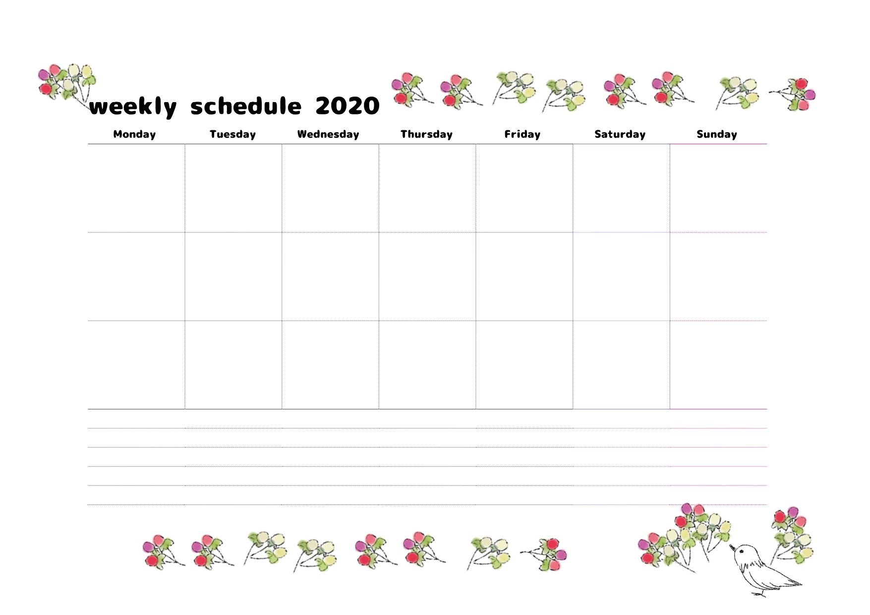 【ウィークリースケジュールのテンプレート】小花がフレームになっているかわいいデザインで壁に貼っても素敵!