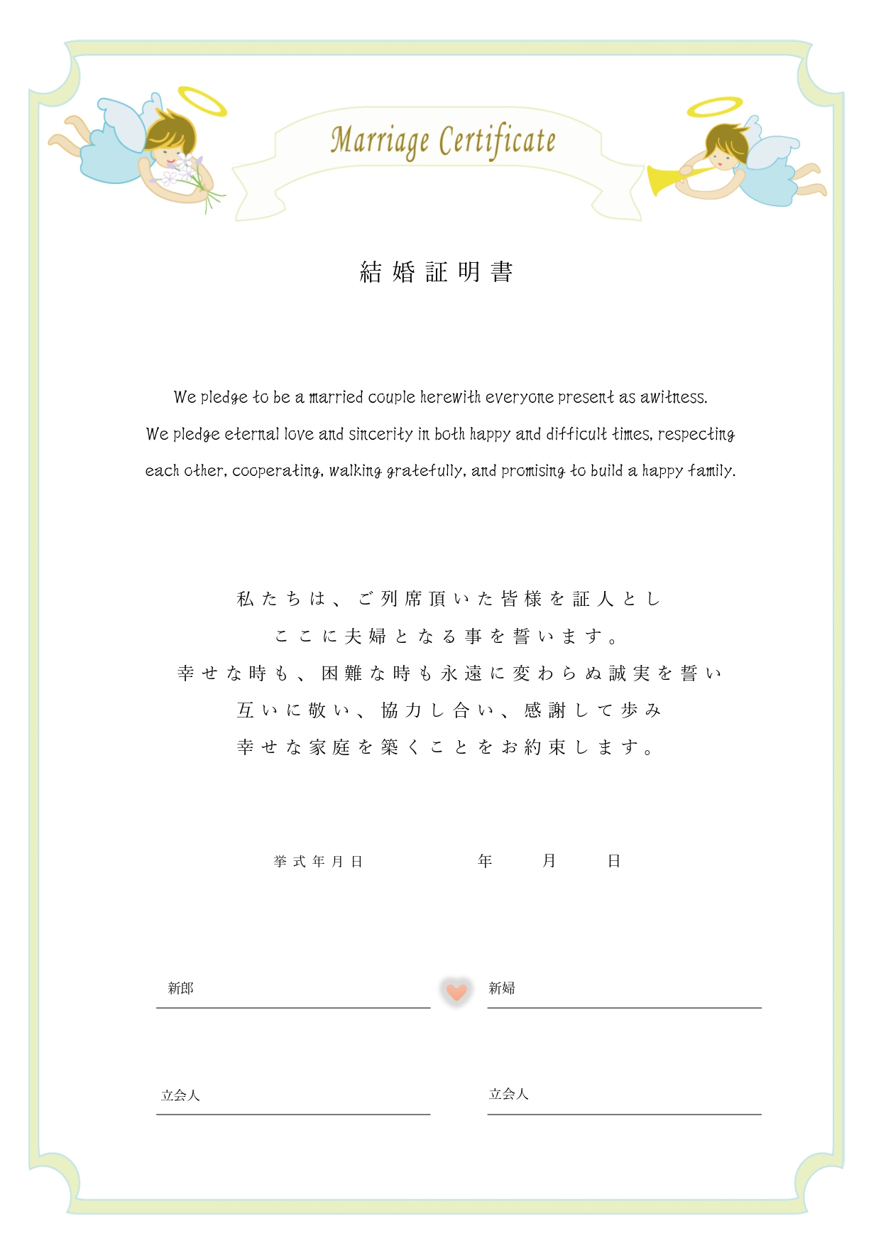 結婚証明書のテンプレート★天使が空飛ぶ、かわいいデザイン! ラッパを持った天使と花束を持った天使をモチーフにした、人前結婚式でご使用していただける結婚証明書のテ