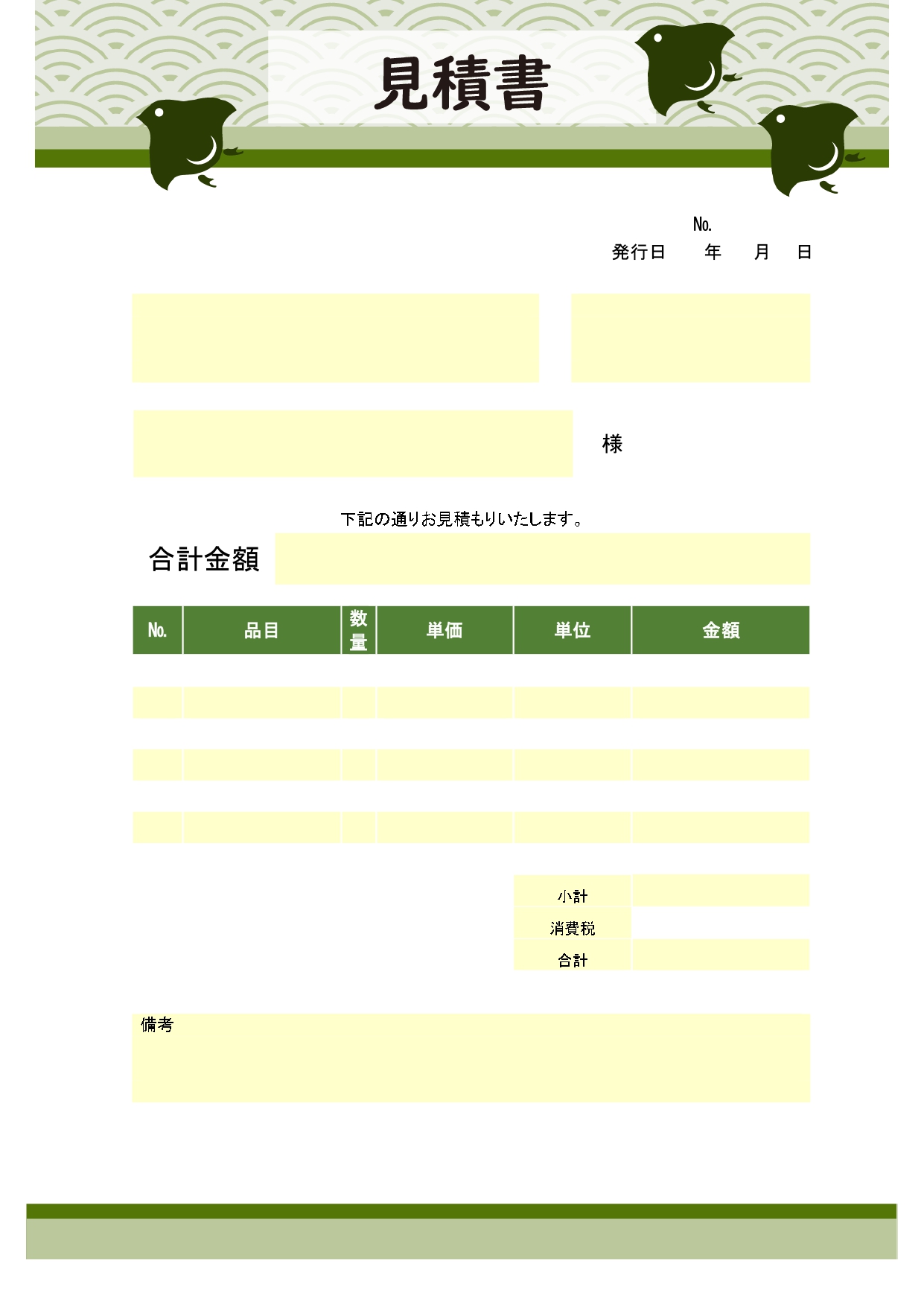 和柄&千鳥(グリーン)かわいいデザインの見積書「Excel・Word・PDF」の素材となり、ダウロードする事で、色々な素材が利用可能です。基本的にはエクセルを推