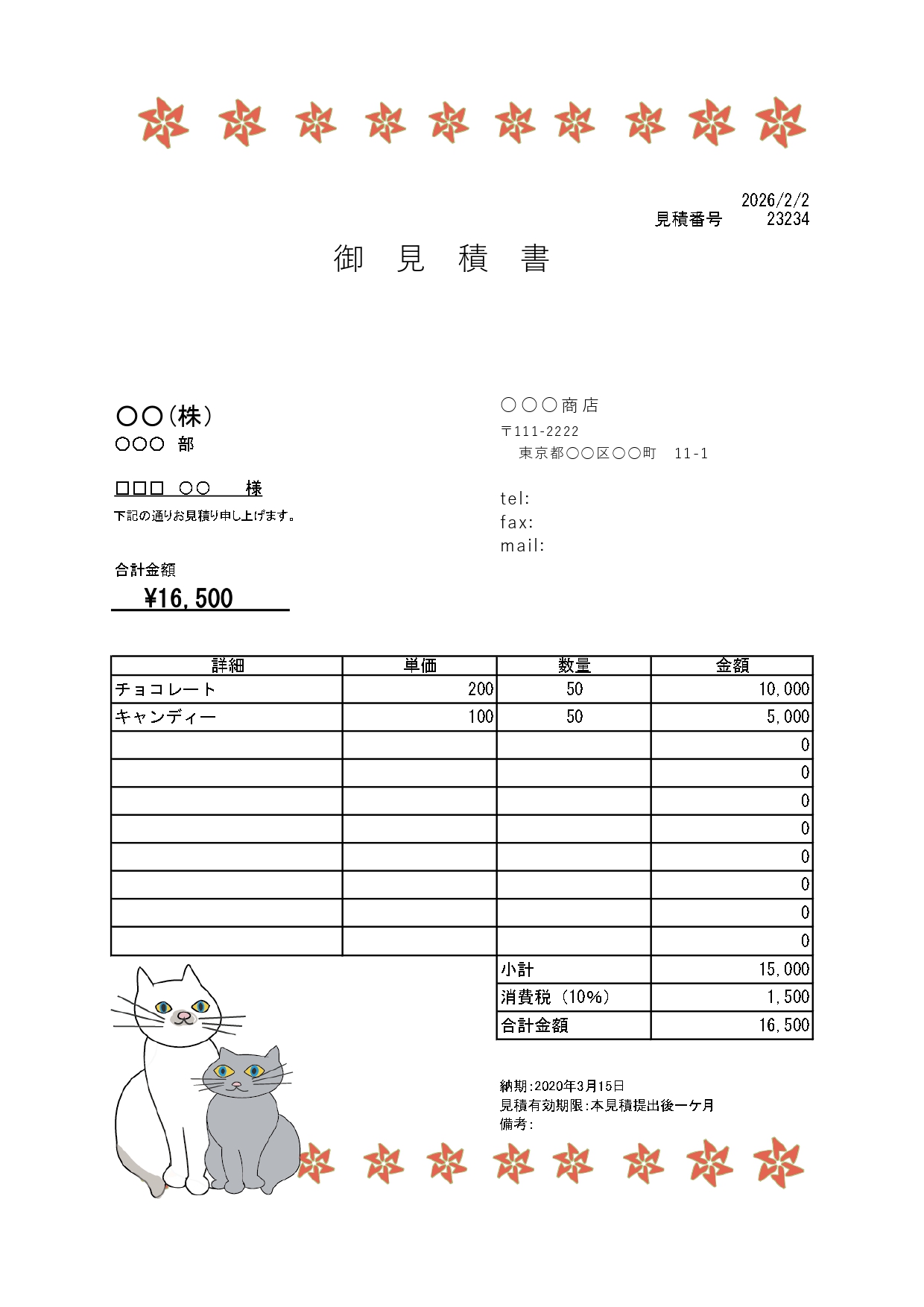 ペットショップや雑貨店などかわいい商品を扱う方におすすめするテンプレートです。Excelは計算式が入っていますので、簡単に見積書を作成できます。納期や見積有効期限が予め決まっている場合は、下部にご記入下さい。オレンジの風車のフレーム上に猫たちを配置して癒しを感じて頂ける見積書を作成しました。どの業種でもお使いいただけるよう発信元、受信者の項目を多めにとりました。