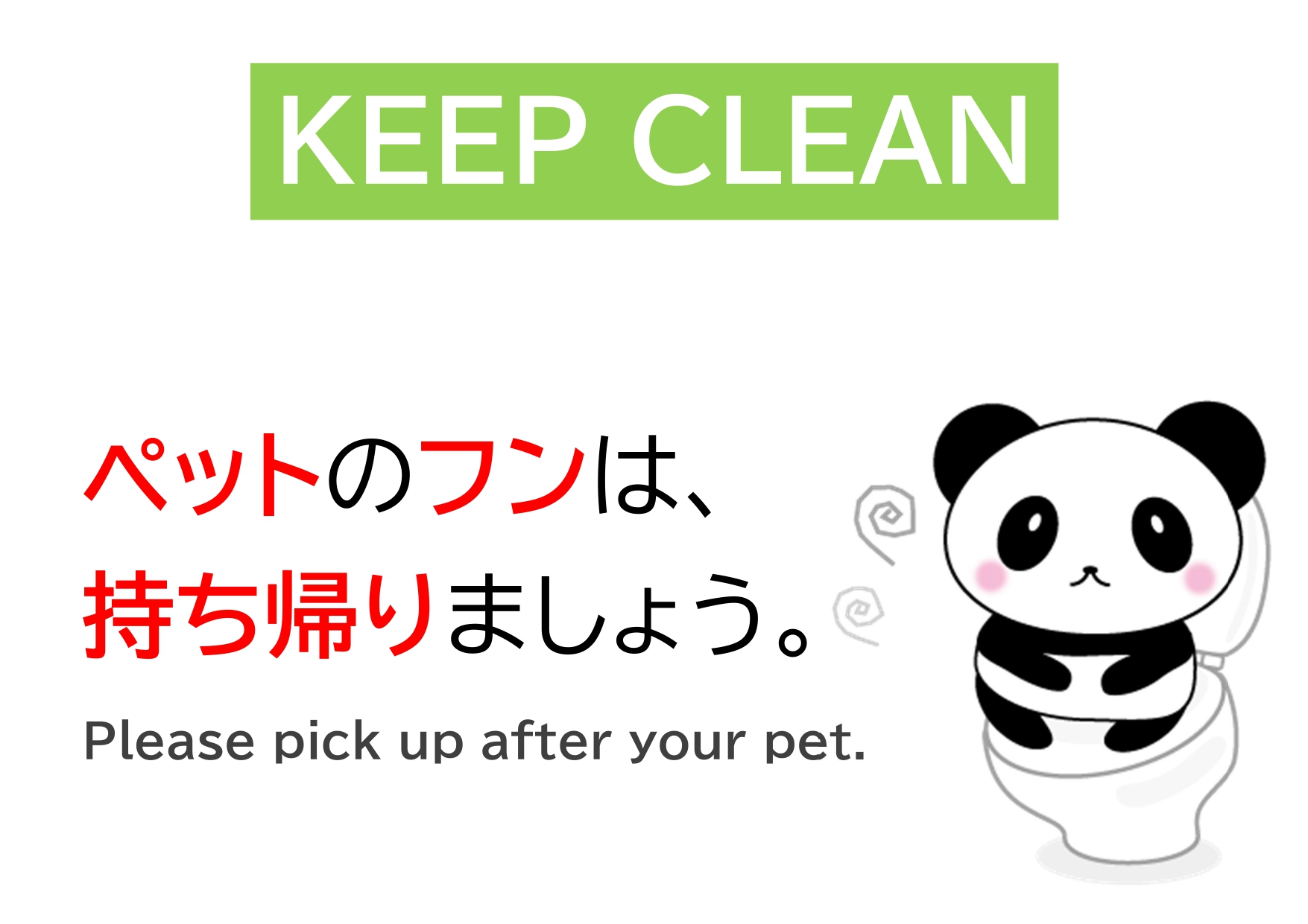 ペットの糞を持ち帰ることを示唆するイラスト入りの張り紙のテンプレートです。可愛らしいパンダのイラストに持ち帰りにおける文言、英語も記載されているので海外の方にもわかりやすいでしょう。簡単に印刷し利用やテキストを編集し利用が可能です。ダウンロードしご利用ください。