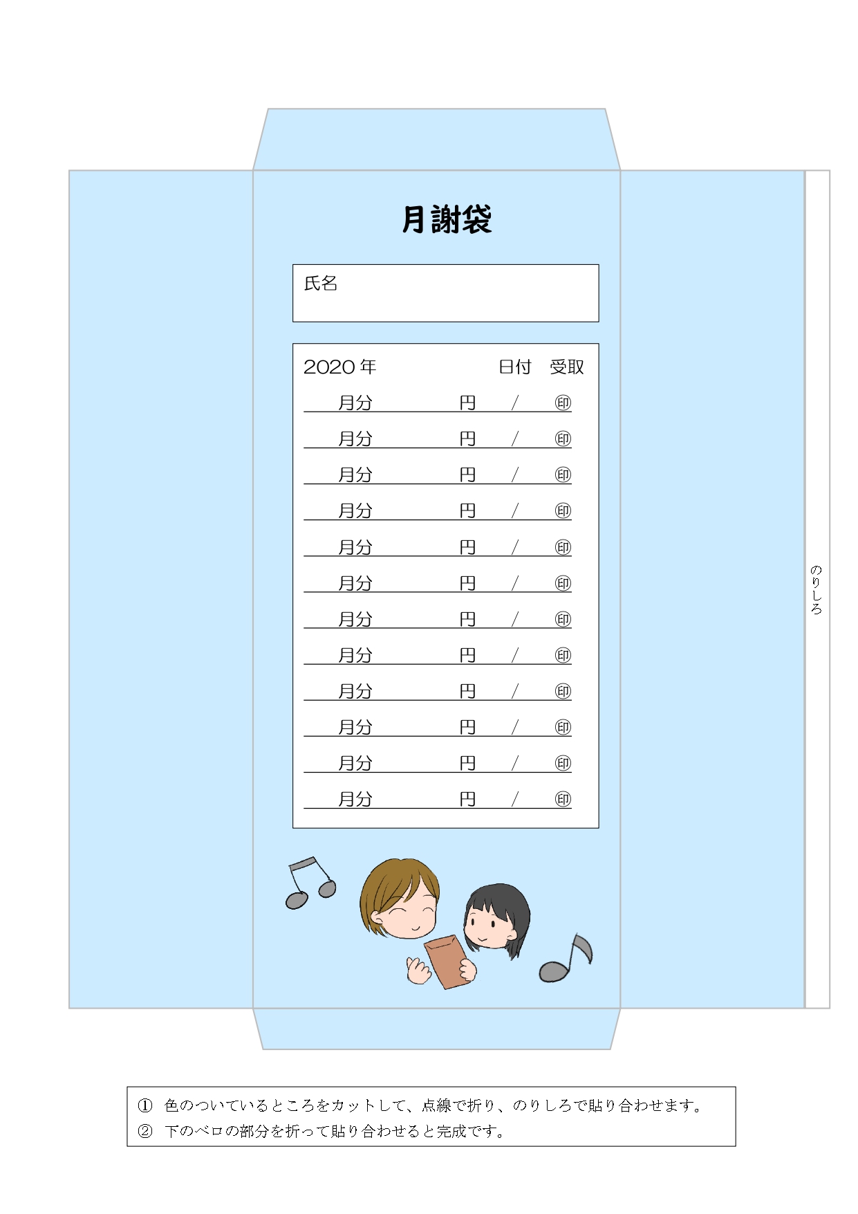 月謝袋を自作できるテンプレートです。音楽系の習い事のぴったりのイラスト入り。もちろん他の習い事でも使えます。12カ月分入れられるようになっており、ハンコを押す欄、受け取った日付を入れる欄もあります。一般的な長3サイズよりも少し小さ目の長4サイズで、お札がぴったり入るようになっています。