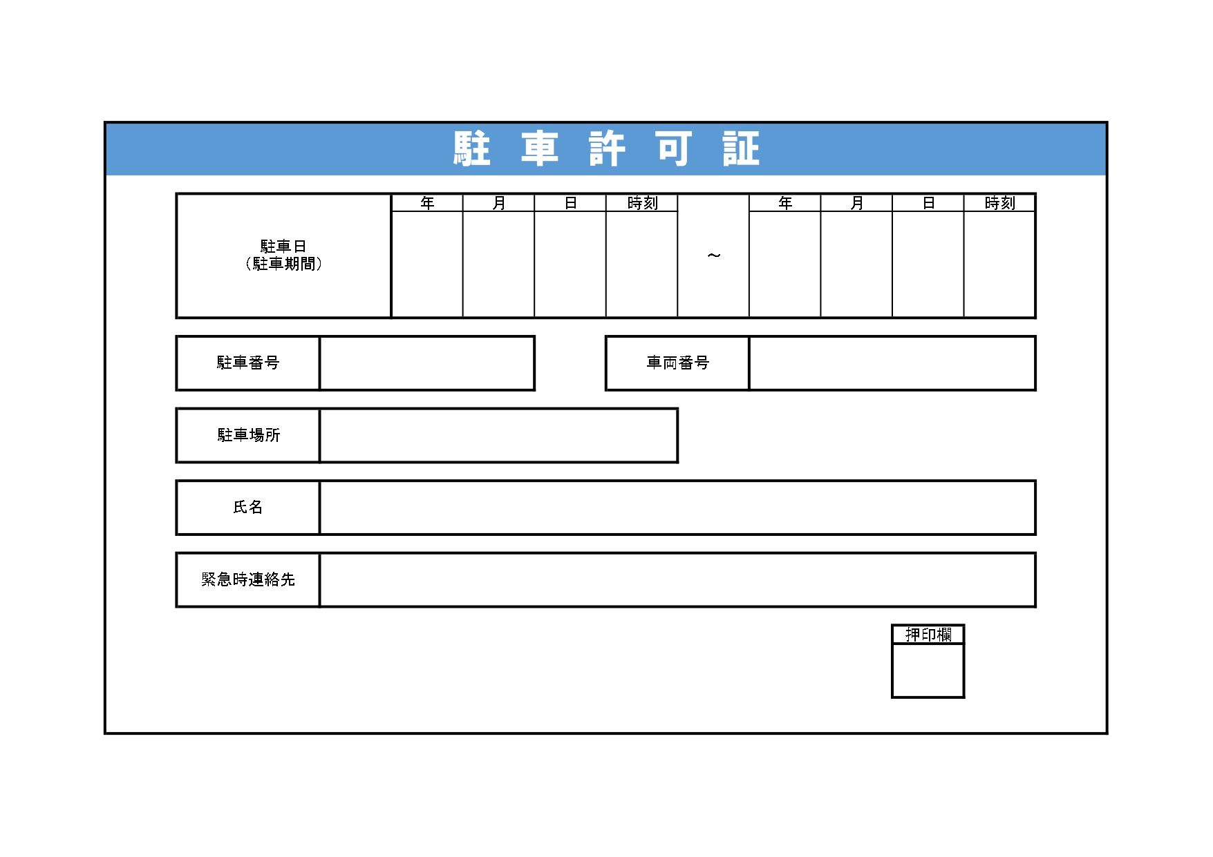 印刷後に手書きで作成いただける駐車許可証で、青い視認性の高い駐車許可証のフレーム。駐車日、期間の年月日と時刻、駐車番号、車両番号、駐車場所、氏名、緊急時連絡先、押印欄から作成されている横向きタイプです。見やすいデザインですので、非常に使いやすいテンプレートとなります。