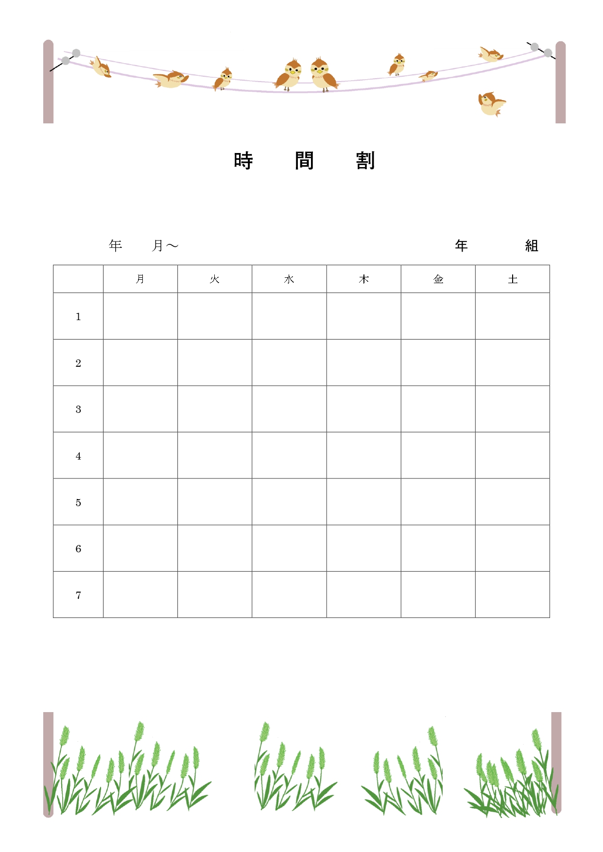 電線に群れて止まるスズメたちがチュンチュンと情報交換している様をフレームにして、時間割表を作成しました。幅広く教育現場でお使い頂けたら嬉しいです。