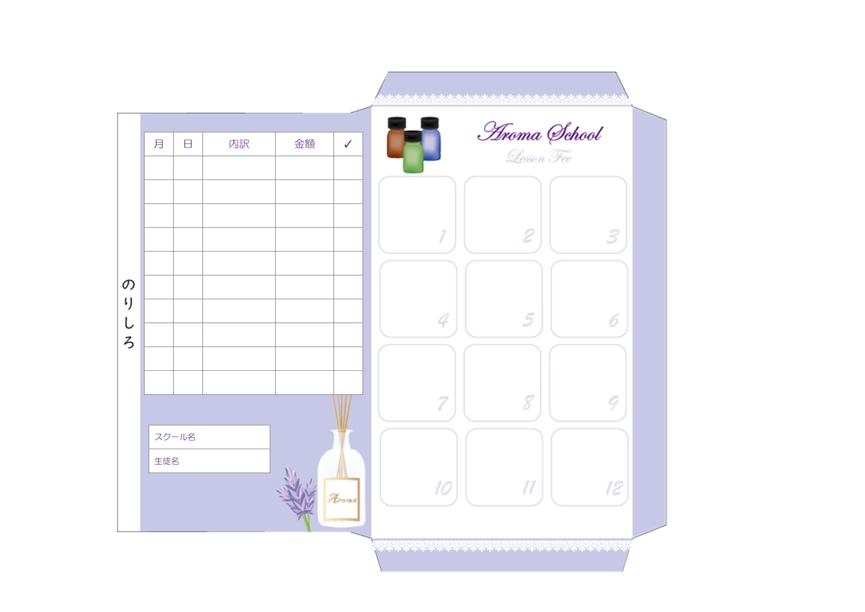 アロマスクールやエステスクールで使える、お月謝袋のテンプレート☆紫色×レースデザインがかわいいテンプレート!