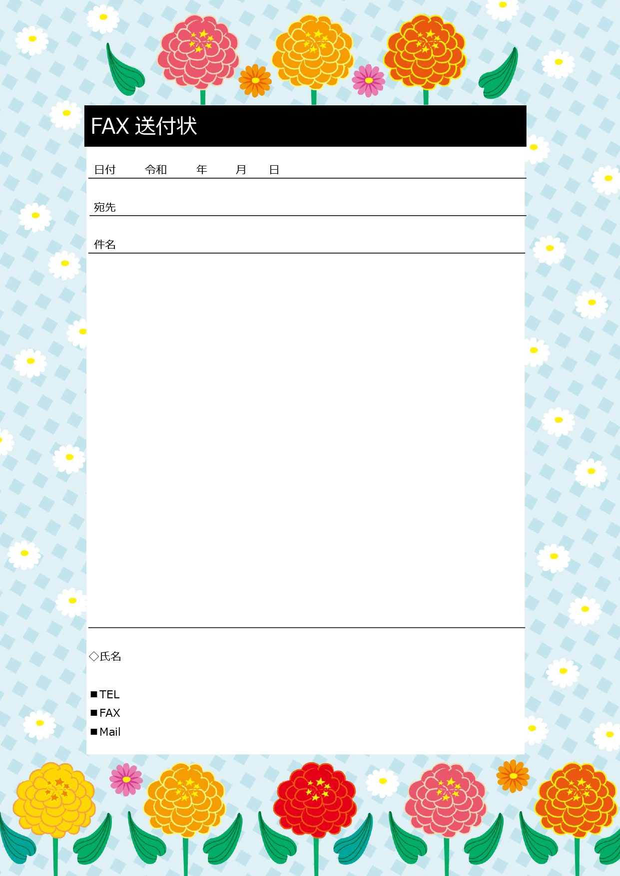 かわいいお花のフレーム付きFAX送付状の無料テンプレートで、個人、店舗など個人経営者におすすめです。花壇や寄せ植えで人気の百日草を描いたものです。インパクトのある大きなお花を送付状デザインにしたため、とても目立ち書類の埋もれ防止に役立ちます。
