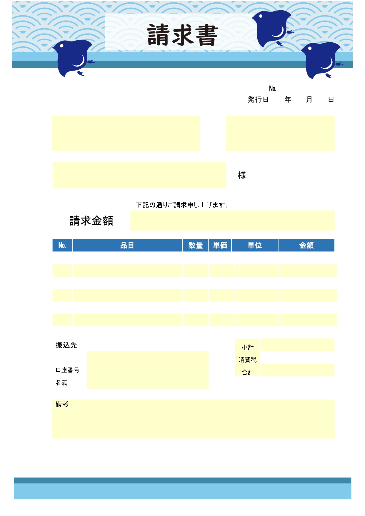 3羽の小鳥(千鳥・ブルー)おしゃれな請求書「Excel・Word・PDF」初めてでも簡単に作成出来るのテンプレートとなります。初めてでも簡単に作成出来る様にワードとPDFもセットとなります。基本的にはエクセルで自動計算を行うのが一番簡単です。千鳥のおしゃれデザインはフリー素材となります。