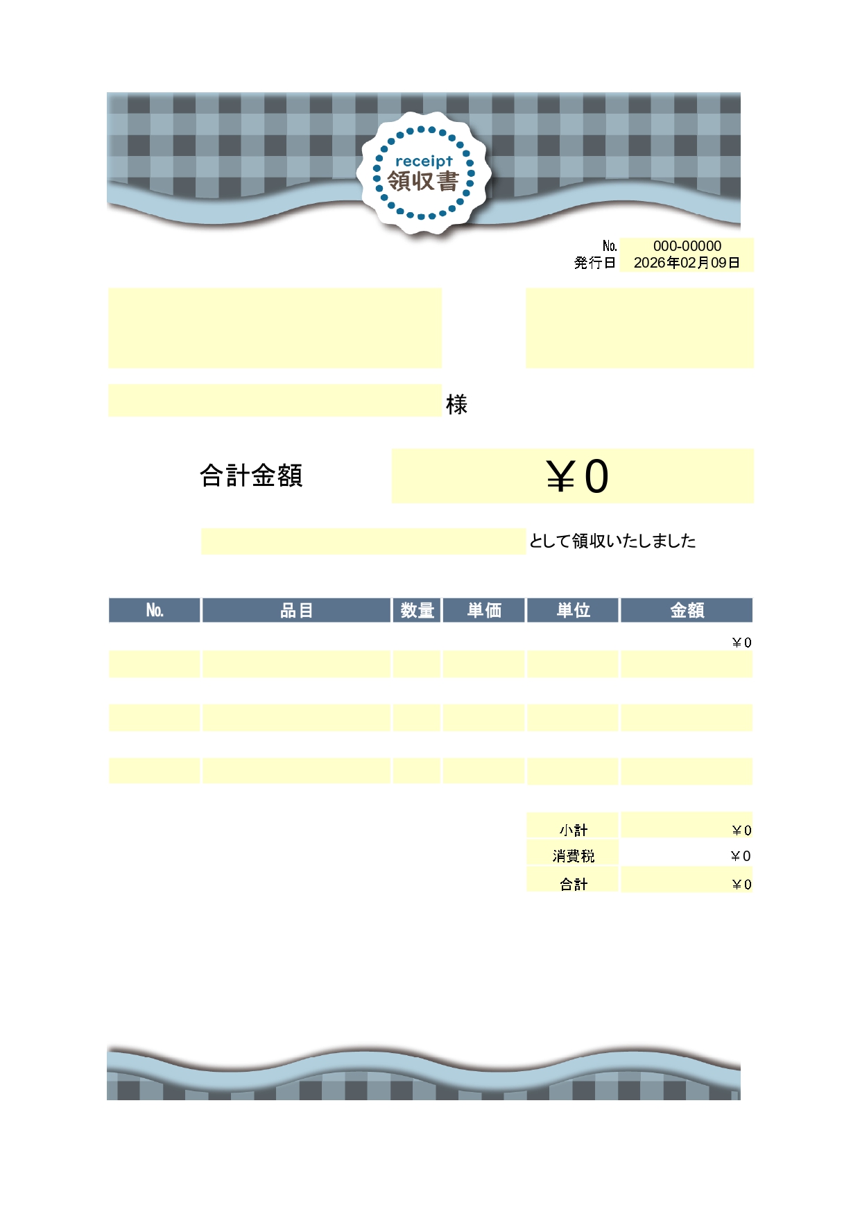 おしゃれなデザインの領収書(ギンガムチェック)A4で簡単印刷「Excel・Word」をダウンロード!おしゃれなデザインの領収書をお探しの場合は、こちらのテンプレートがおすすめです。エクセルとワードは簡単に内容の編集が可能で、編集後にPDF化を行う事や印刷をA4で簡単に出来るテンプレートとなります。