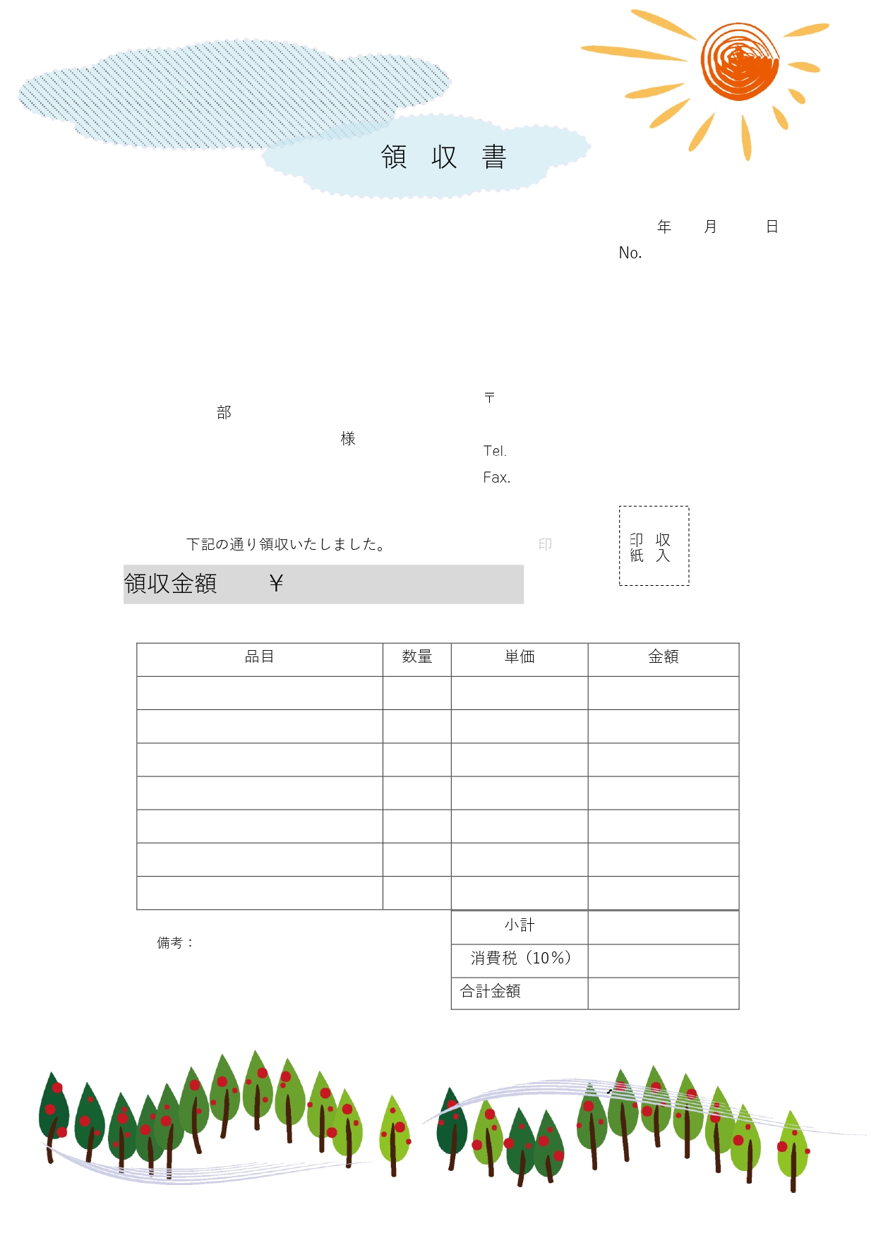 太陽と森のイラスト入りで、爽やかで心地の良い感じのする癒しの領収書テンプレート! 太陽と雲を上部のフレームに、下部には緑のグラデーションの木々、そして吹き渡る風