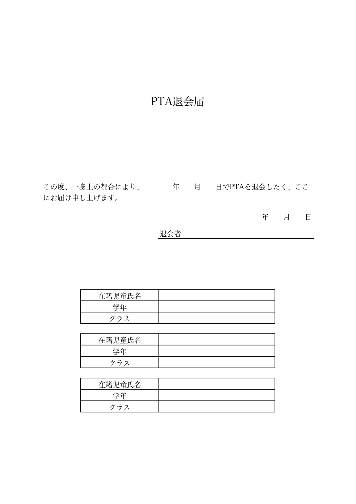 PTA退会届のテンプレートです。様々な都合や理由でPTAを退会しなくてはならないことはありますよね。しかしながら、そう頻繁に起こることでは無いため、いざ手続きしようと思っても、届出書類の作成に困る方は沢山いると思います。決まったテンプレートを使う事で非常に楽に作成が出来ます。