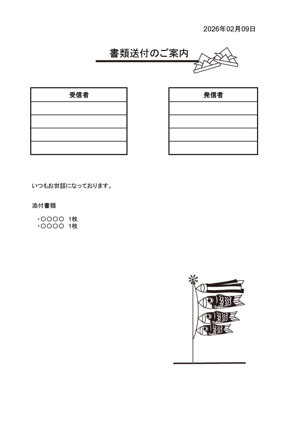 書類&FAX送付状(5月(子供の日・兜の折り紙・鯉のぼり)イラストかわいいデザイン)「Excel・Word」をダウンロード出来る素材となり、5月のイベント、子供の日のかわいいイラストが描かれている送付状です。テキストは削除、編集が可能ですので、ワードやエクセルで自由に編集頂く事が出来ます。