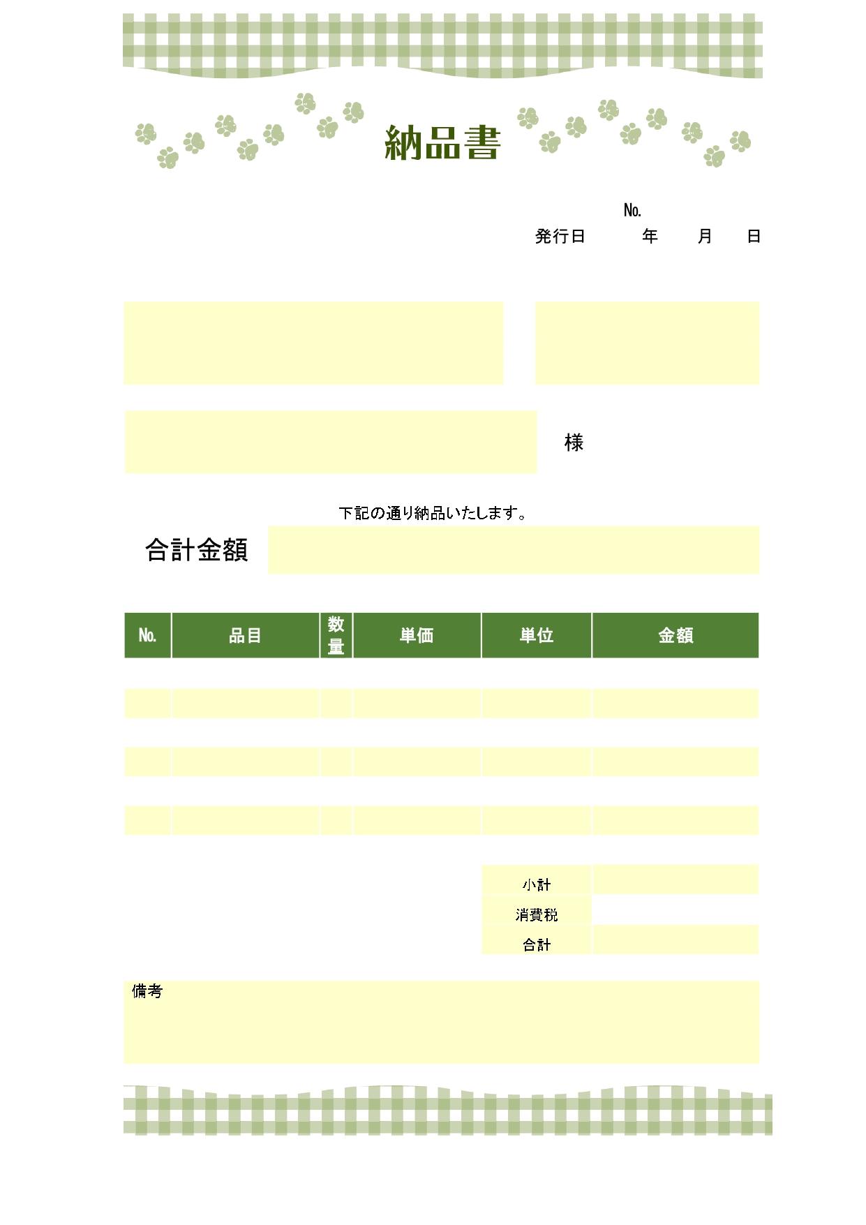 グリーンをベースにギンガムチェックと足跡のイラストが入ったかわいい納品書のテンプレート! 爽やかなグリーン系でデザインされた、納品書のテンプレート(A4)です。