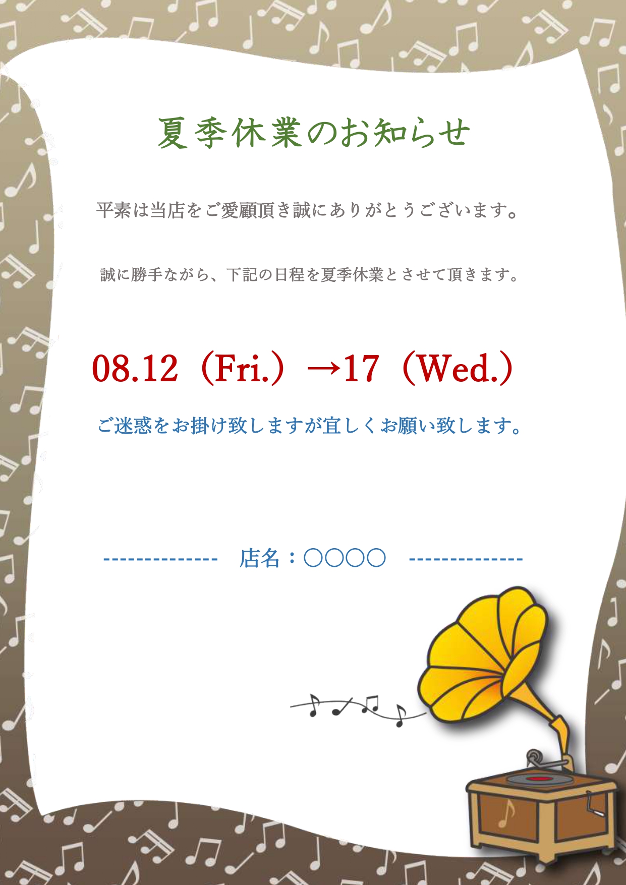 店舗やお店で利用が可能な夏季休業の張り紙やお知らせ素材を可愛いイラスト入りをダウンロード 店舗やお店の夏のお休み期間をお客様や顧客に案内を簡単に行えるテンプレートとなり、夏季休業のお知らせを店舗のドアや入口に貼る場合や店舗の店内にて早