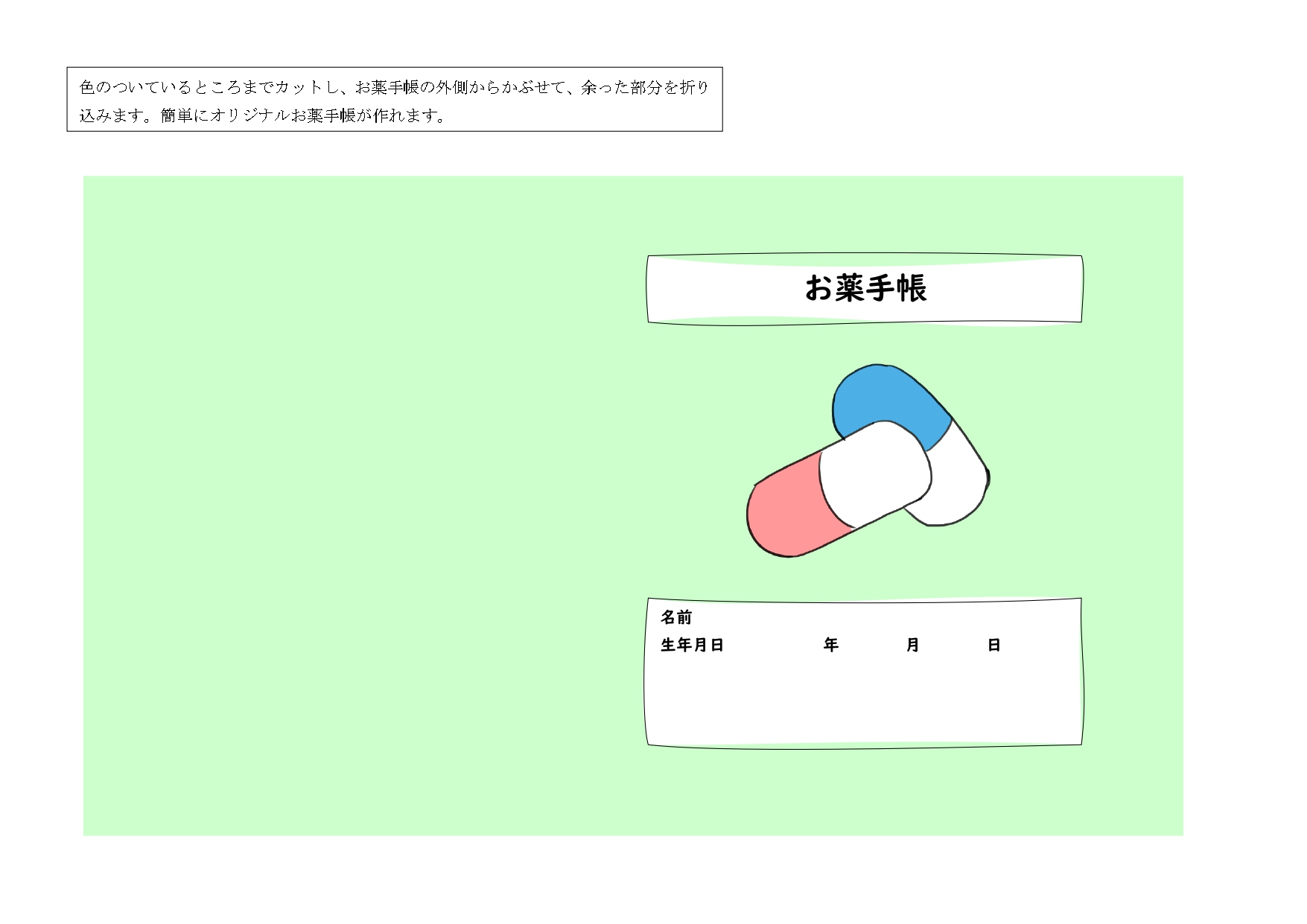 一般的なサイズのお薬手帳に使えるカバーです。名前と生年月日を記入できる欄つき。簡単に、オリジナルのお薬手帳が完成します。線に沿って切ったあと、手帳にかぶせ、余った部分を内側に折り込むだけで使えます。お薬をイメージした、かわいくてシンプルな手書き風イラスト入り。A6くらいの一般的な大きさのおくすり手帳向けの大きさなので、規格が異なる場合は、拡大・縮小などでサイズを合わせてご利用ください。大きめにしたほうが微調整がしやすくなります。Word推奨。
