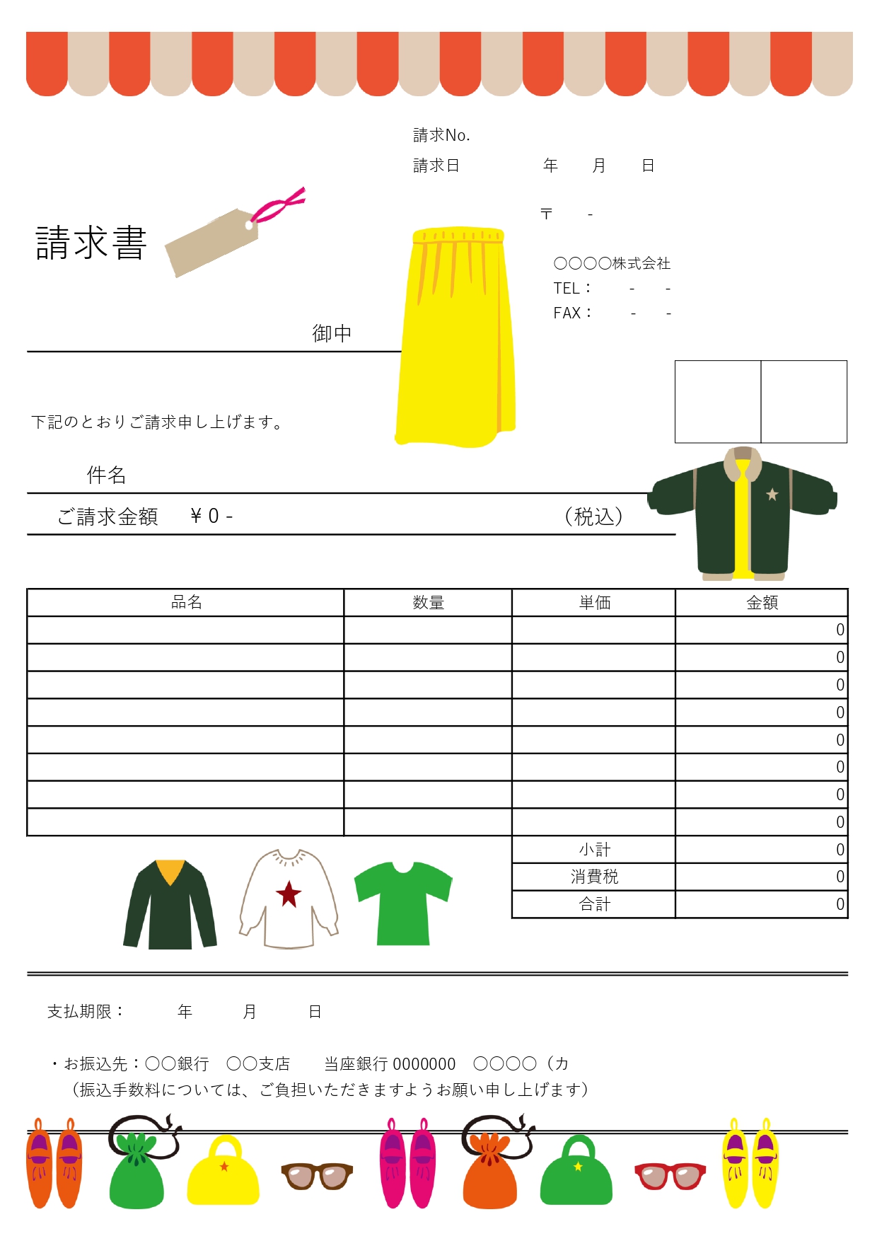 アパレル向け請求書のテンプレート|かわいい洋服のイラストが陳列するおしゃれなデザイン!個人でも使えるフォーマット!