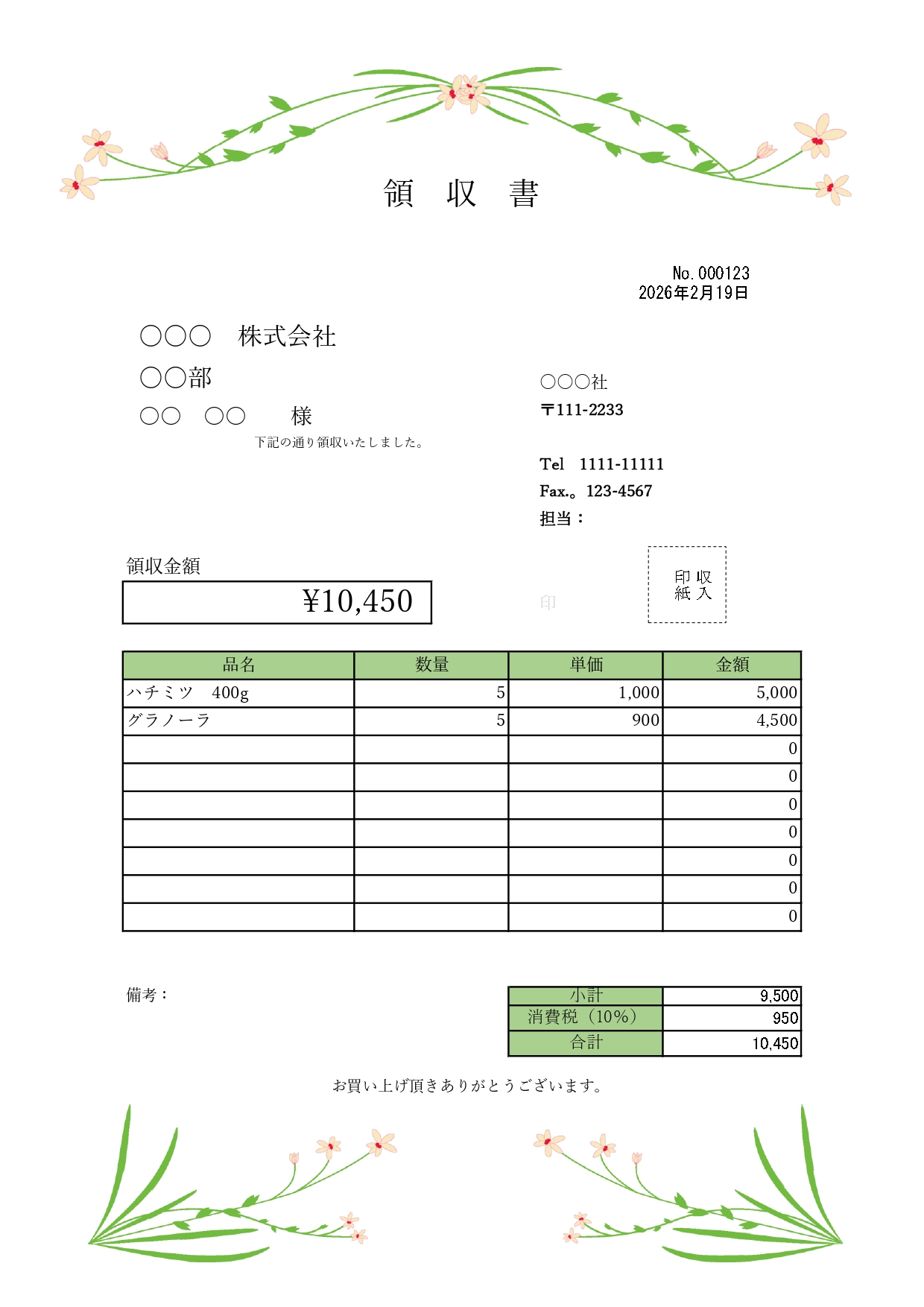 ヒメヒオウギの花がデザインされた領収書「Excel・Word」のかわいい素材となり、上下に小さくかわいいヒメヒオウギの花がワンポイントで描かれております。項目部分は非常にシンプルなデザインとなりますので、ヒメヒオウギのデザインなどで、領収書を作成されたい場合におすすめのテンプレートです。