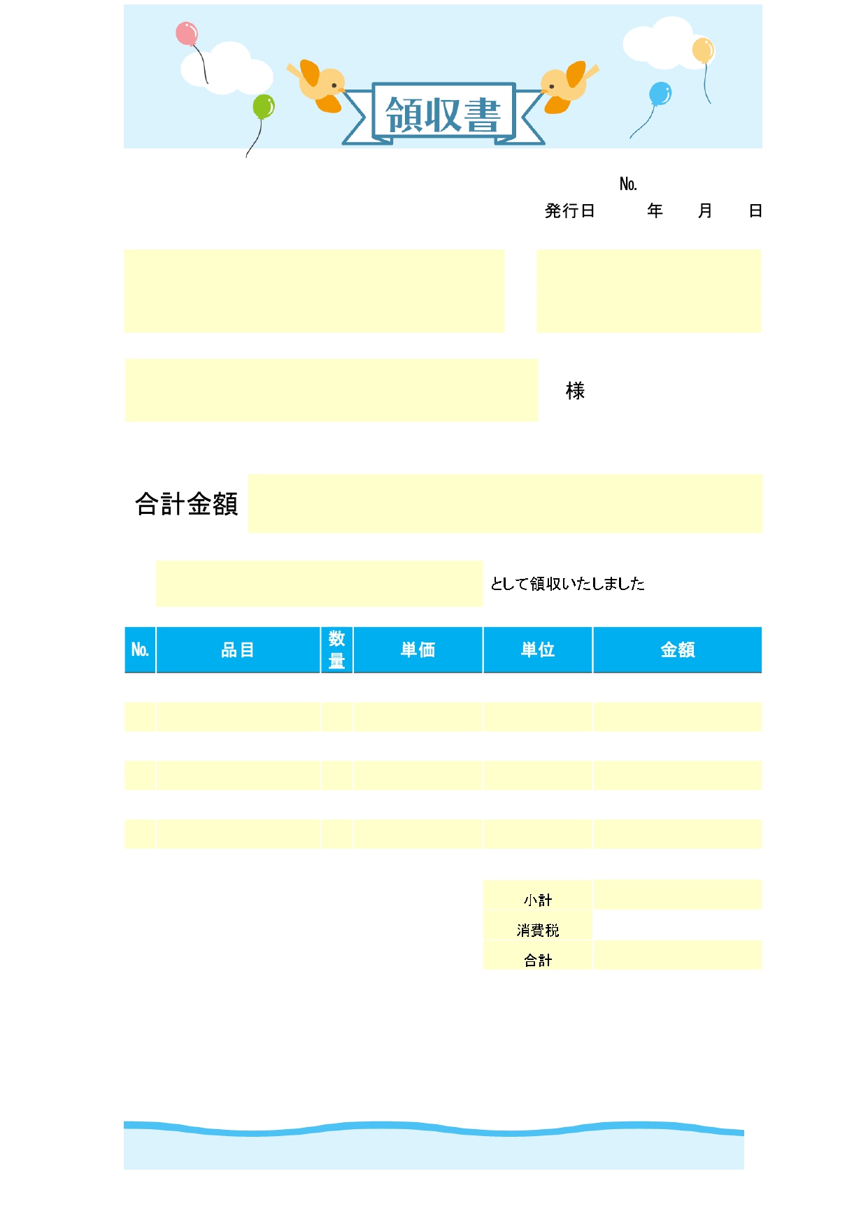 ブルーのグラデーションが入った爽やかでおしゃれな領収書のテンプレート! 爽やかなブルー系を基調とし、下部は綺麗なグラデーションになっているおしゃれなテンプレートです。また、こちらの特徴は、罫線ではなく、余白を利用して枠組を演出している