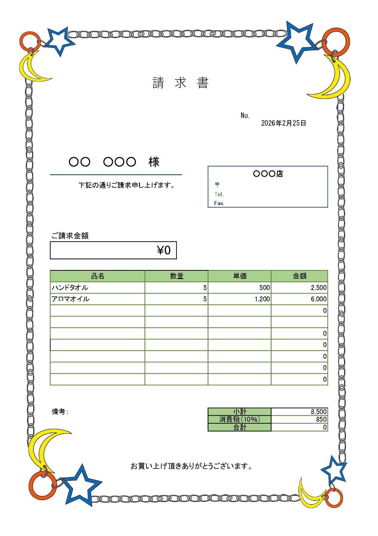 請求書(太陽・月・星・チェーン)カラフルでオシャレ「Excel・Word」店舗・雑貨店・小売りにおすすめのテンプレートとなります。フレーム状にカラフルに描かれたアクセサリーのイラスト入りの請求書となります。アクセサリーの販売店や雑貨店・個人事業主などにおすすめです。