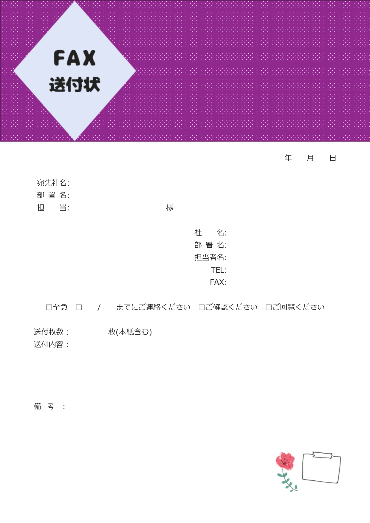 一般的なオフィスや事業所、ショップでお使いいただけるFAX送付状のテンプレートです。デザイン性がある、おしゃれなデザインで、お送りする書類の表紙としてご活用ください。PDF、Excel、Wordのフォーマットがあります。