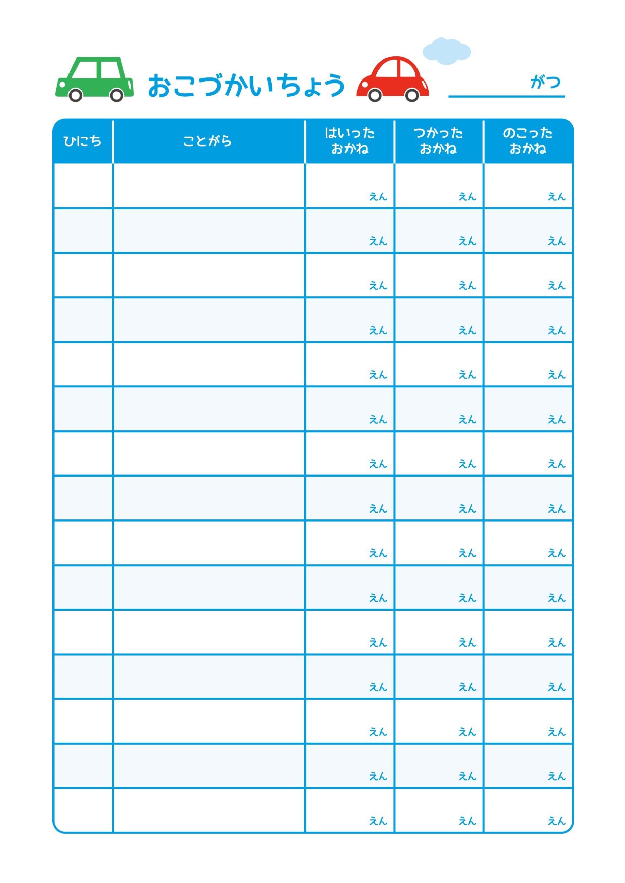 【小学生向け】初めてのお小遣い帳にぴったりの、ひらがな&かわいい車のデザイン入りテンプレート