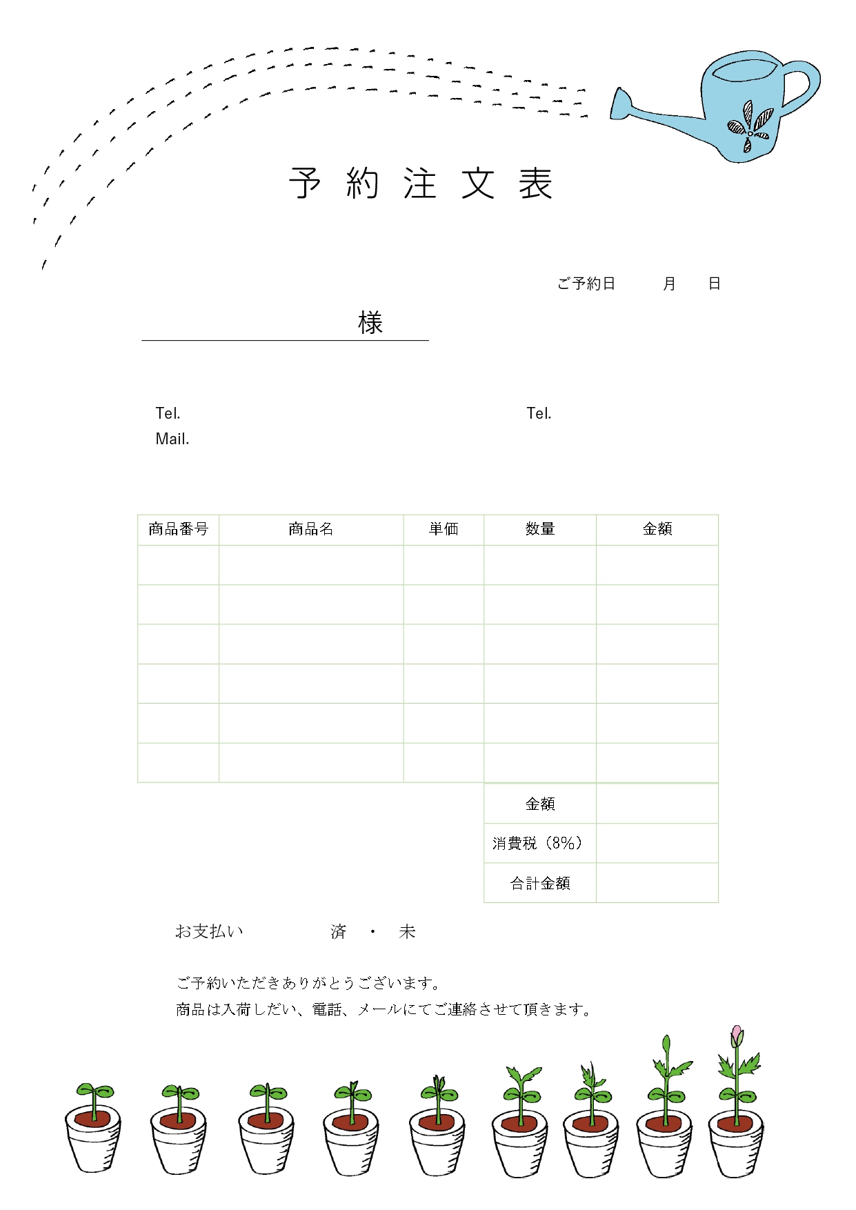 鉢植えとジョウロの手書き風イラストが入った、かわいい予約注文表のテンプレート<フラワーショップにおすすめ>
