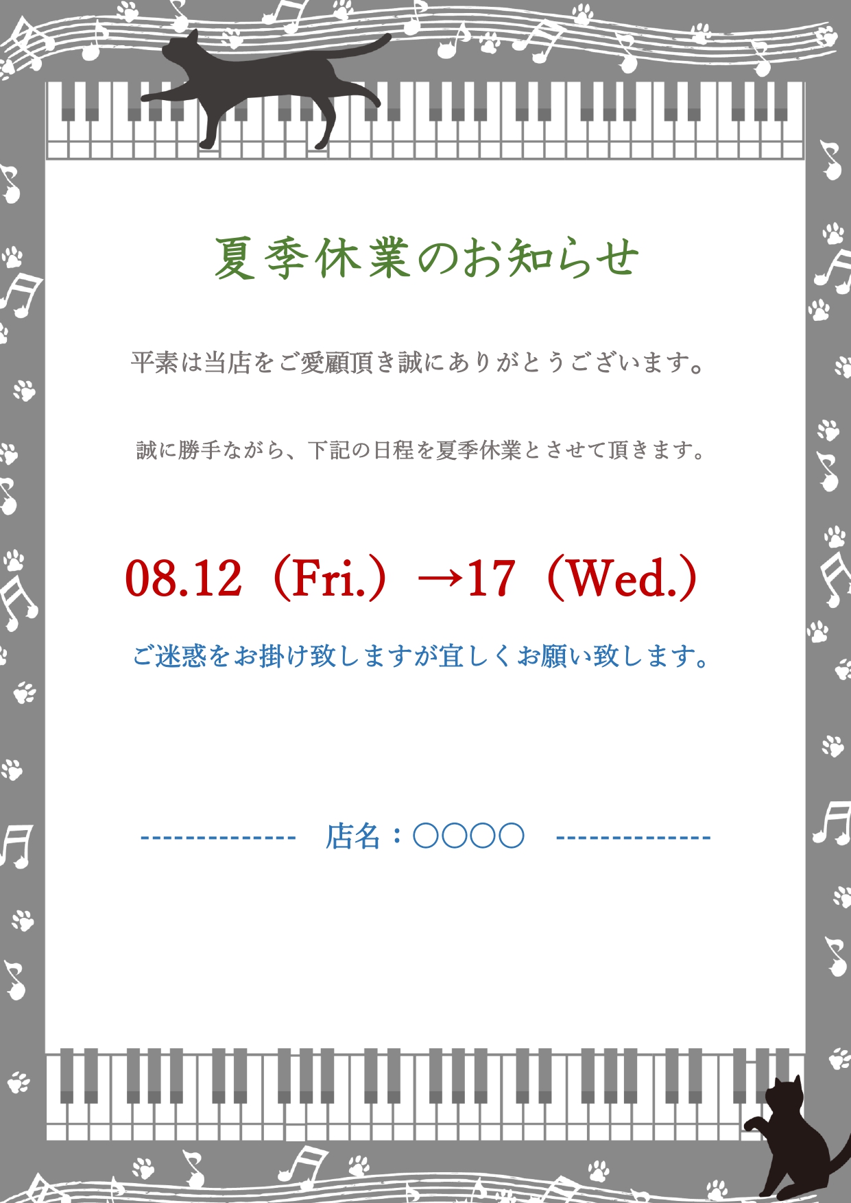 夏季休業のお知らせの張り紙「Word」で簡単に編集可能・メール添付用にPDF化も可能 夏季休業のお知らせに使えるクマのヌイグルミが描かれている張り紙となります。Wordで簡単にテキストの編集が可能なので、編集後にPDF化しメール添付用