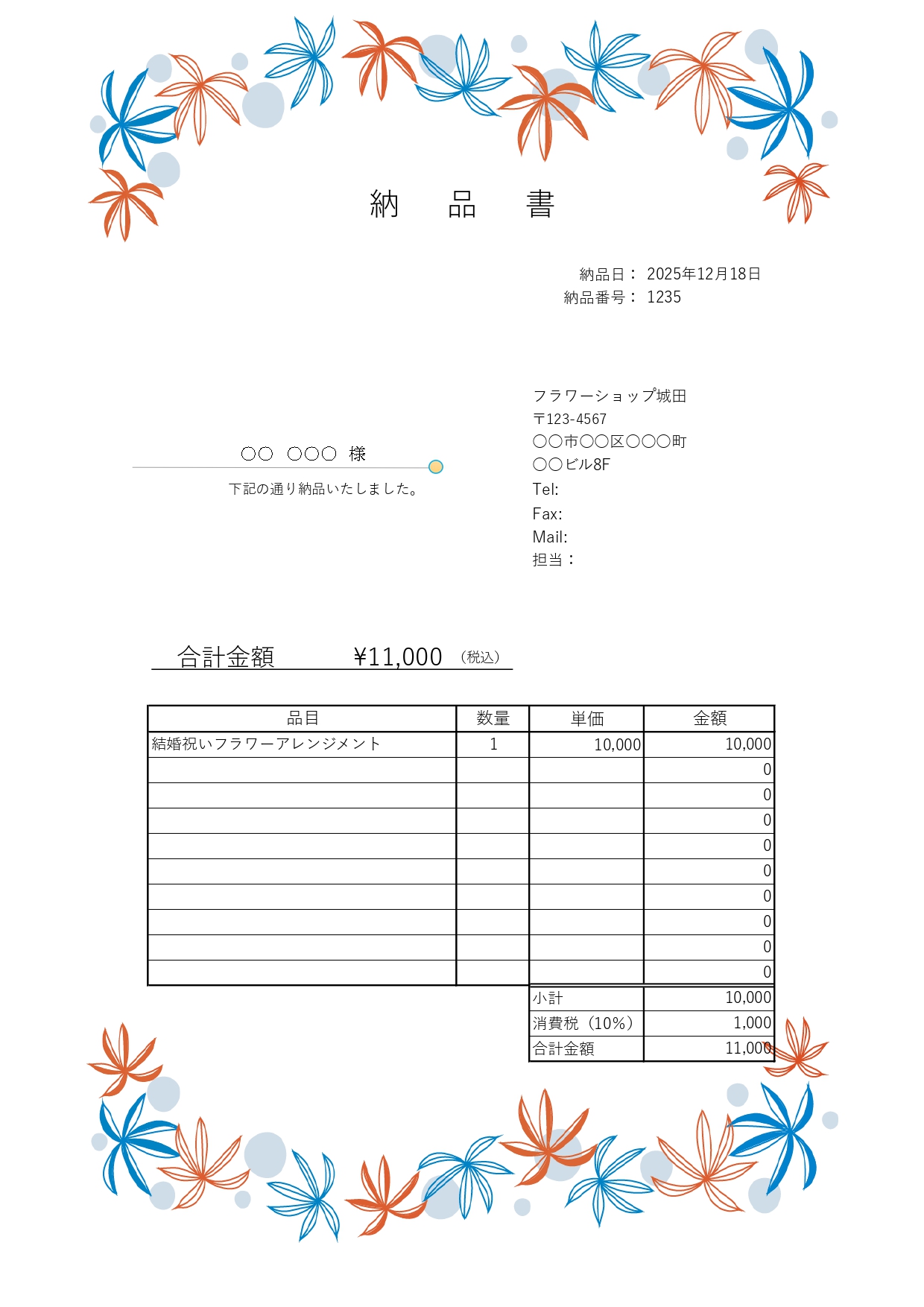 納品書「Excel・Word」北欧風タッチに描かれた赤と青の花が上下に舞っているデザインのテンプレートとなります。固くなりがちが納品書にフレームを設置してあり、おしゃれな納品書をお探しの場合におすすめの素材となります。ダウンロード後にご利用頂けます。