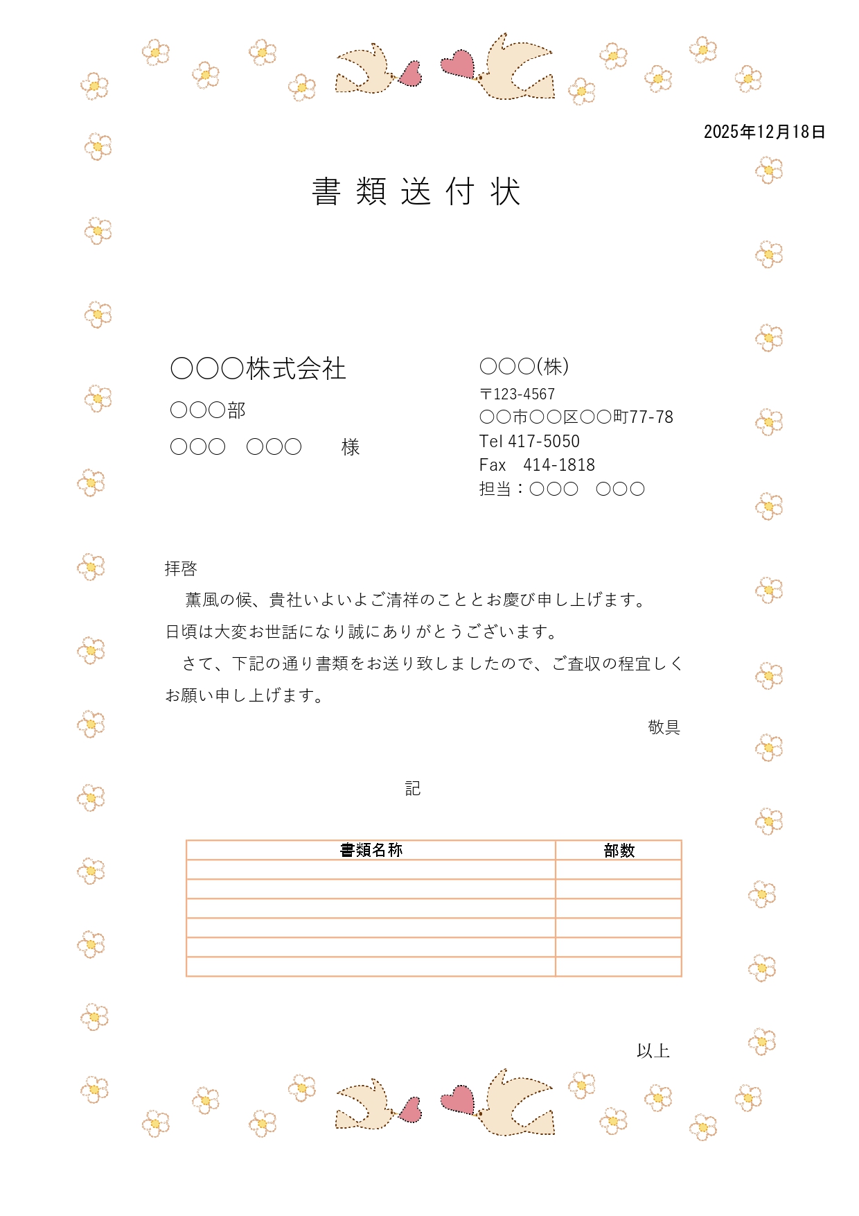 企業宛・個人宛におすすめの書類送付状(可愛い小鳥と小花とハート)のテンプレートとなり、ビジネスや個人、病院関係の方が書類を送付したい時に、書類送付状としてご利用頂ける無料テンプレートです。幸せを運ぶ鳥のようで、おしゃれでかわいいデザインは、受け取り相手にも喜んで頂けると思います。